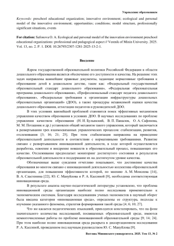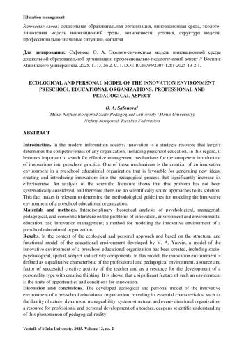 Обсуждение и заключения. Разработанная эколого-личностная модель инновационной среды дошкольной образовательной организации, раскрывающая ее сущностные характеристики, такие как двойственность природы, динамичность, управляемость, системно-структурная и событийно-ситуационная организация, ресурс профессионально-личностного развития педагога, углубляет научные представления о данном феномене педагогической действительности.
