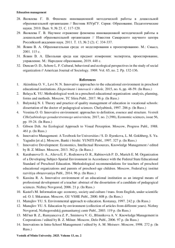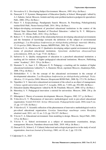 1. Акиншина О. В., Леви Н. Н. Инновационные подходы к образовательной среде в ДОУ // Эксперимент и инновации в школе. 2015. № 6. С. 48-59.