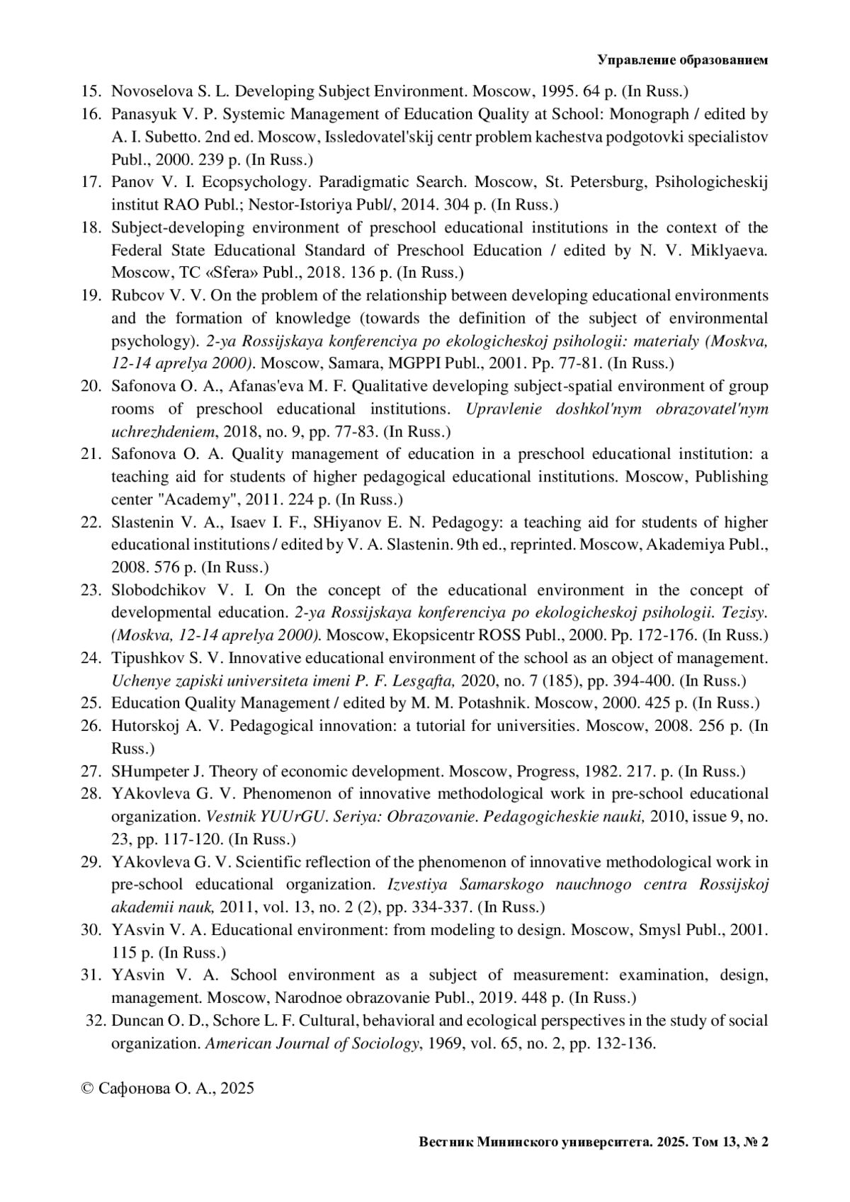 31. Ясвин В. А. Школьная среда как предмет измерения: экспертиза, проектирование, управление. М.: Народное образование, 2019. 448 с.