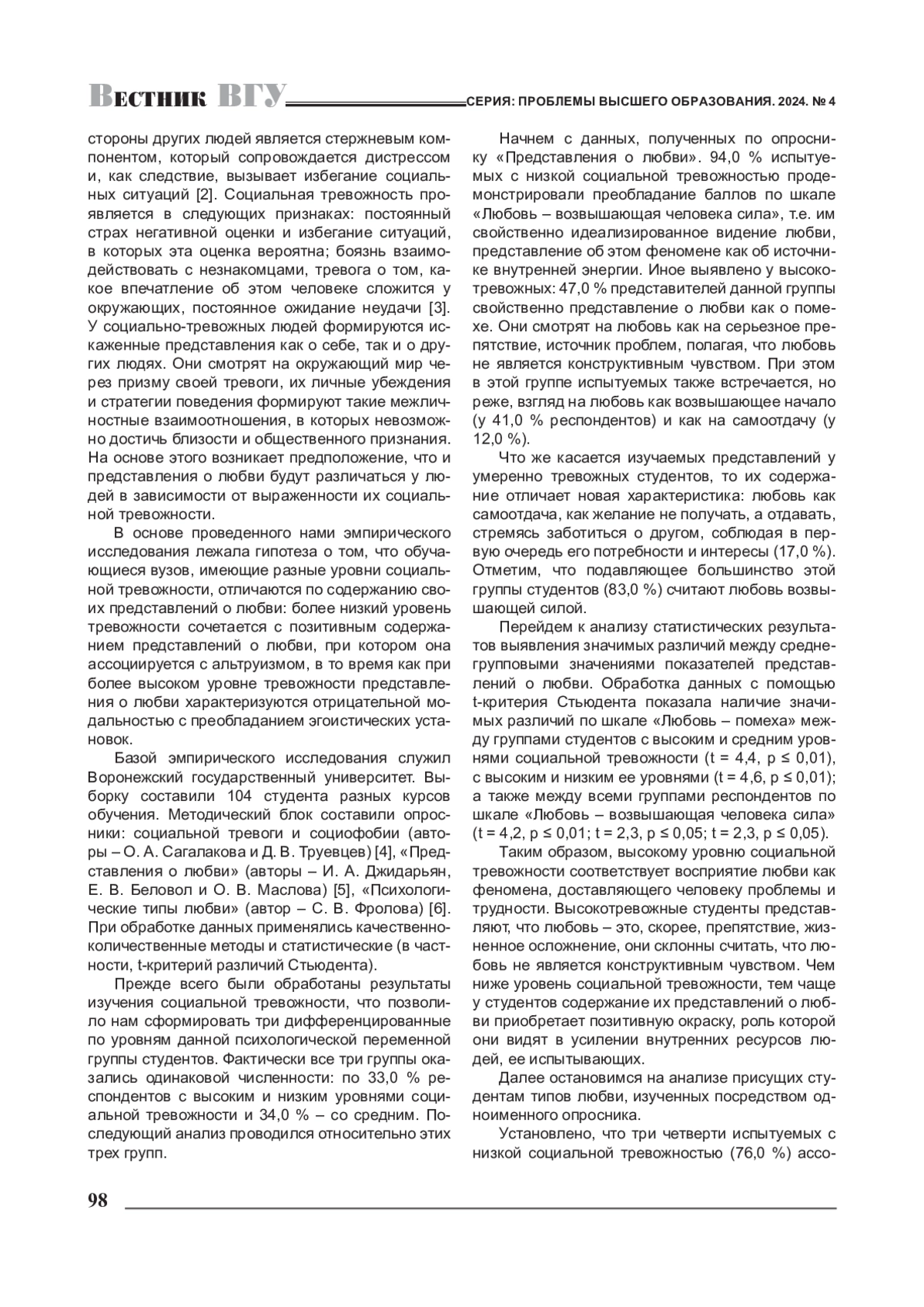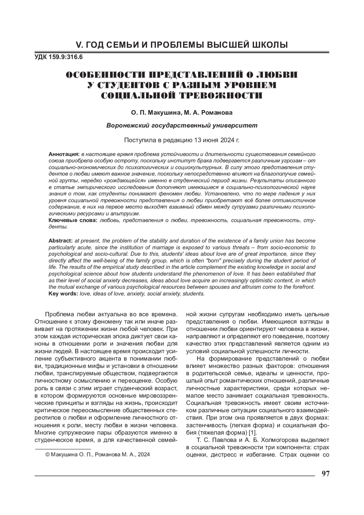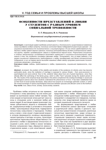 В настоящее время проблема устойчивости и длительности существования семейного союза приобрела особую остроту, поскольку институт брака подвергается различным угрозам - от социально-экономических до психологических и социокультурных. В силу этого представления студентов о любви имеют важное значение, поскольку непосредственно влияют на благополучие семейной группы, нередко «рождающейся» именно в студенческий период жизни. Результаты описанного в статье эмпирического исследования дополняют имеющиеся в социально-психологической науке знания о том, как студенты понимают феномен любви. Установлено, что по мере падения у них уровня социальной тревожности представления о любви приобретают всё более оптимистичное содержание, в них на первое место выходят взаимный обмен между супругами различными психологическими ресурсами и альтруизм.