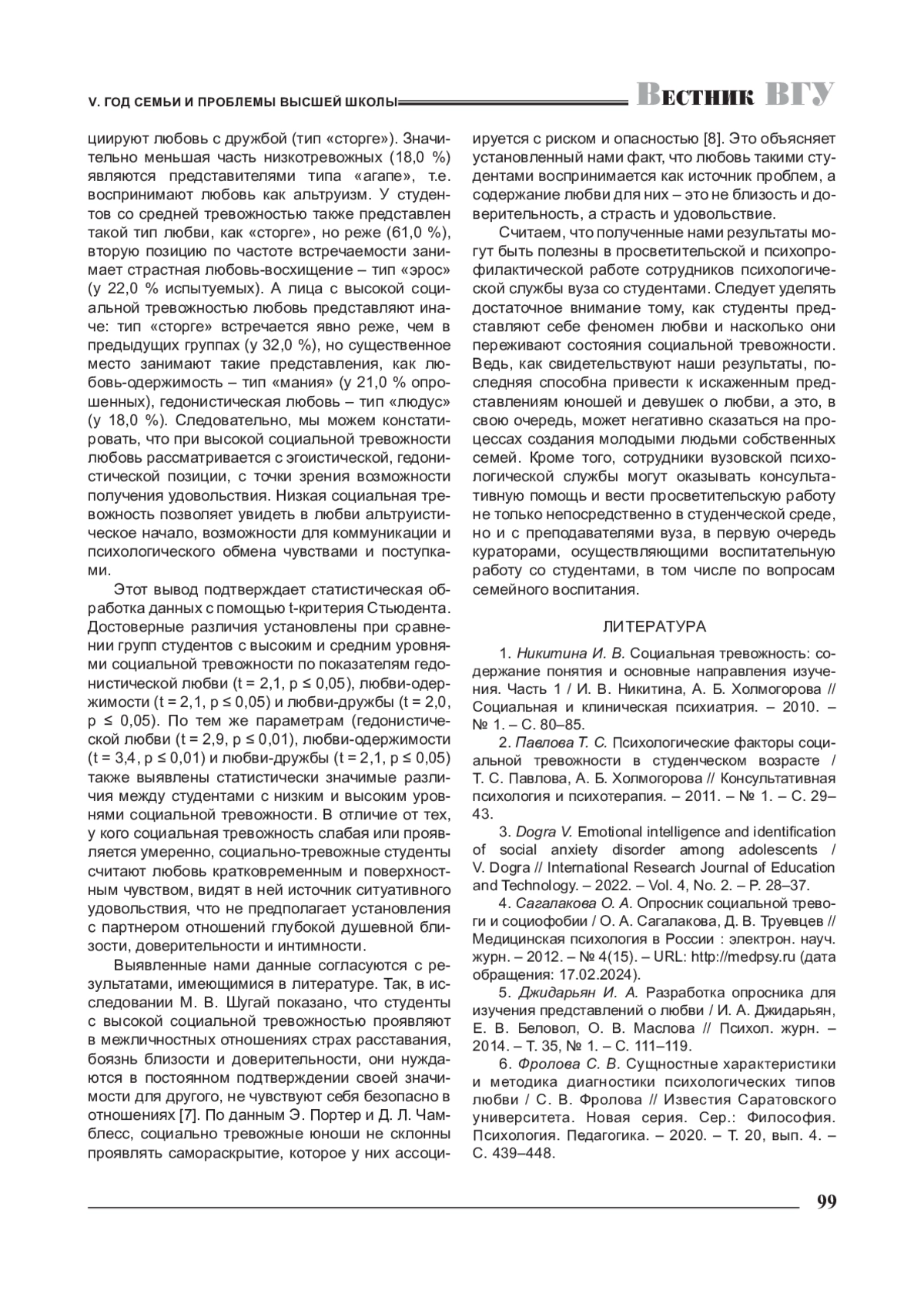 2. 	Павлова Т. С. Психологические факторы социальной тревожности в студенческом возрасте / Т. С. Павлова, А. Б. Холмогорова // Консультативная психология и психотерапия. - 2011. - № 1. - С. 2943. EDN: RNDZGP