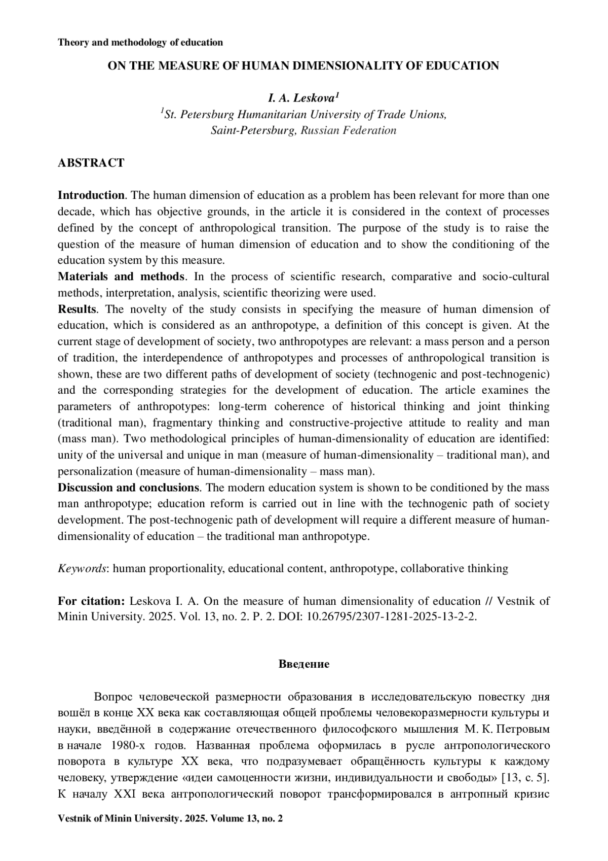 Результаты исследования. Новизна исследования состоит в конкретизации меры человеческой размерности образования, в качестве которой рассматривается антропотип, дано определение этого понятия. На современном этапе развития общества актуальны два антропотипа: человек массовый и человек традиции, показана взаимообусловленность антропотипов и процессов антропологического перехода, это два разных пути развития общества (техногенный и посттехногенный) и соответствующие им стратегии развития образования. Рассматриваются параметры антропотипов: долгая связность исторического мышления и совместность мышления (человек традиции), фрагментарность мышления и конструктивно-проективное отношение к реальности и человеку (человек массовый). Выделено два методологических принципа человекоразмерности образования: единства универсального и уникального в человеке (мера человекоразмерности – человек традиции), персонализации (мера человекоразмерности – человек массовый).