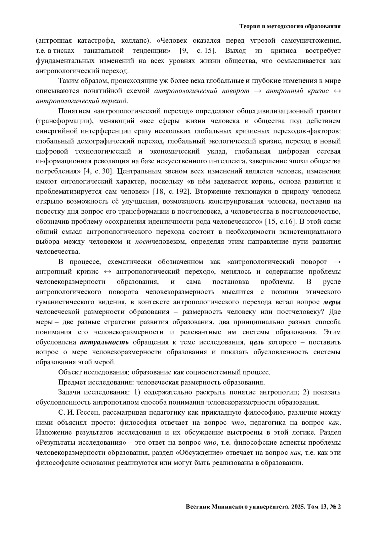Введение. Человеческая размерность образования как проблема актуальна не одно десятилетие, что имеет под собой объективные основания, в статье она рассматривается в контексте процессов, определяемых понятием антропологический переход. Цель исследования – поставить вопрос о мере человекоразмерности образования, показать обусловленность системы образования этой мерой.