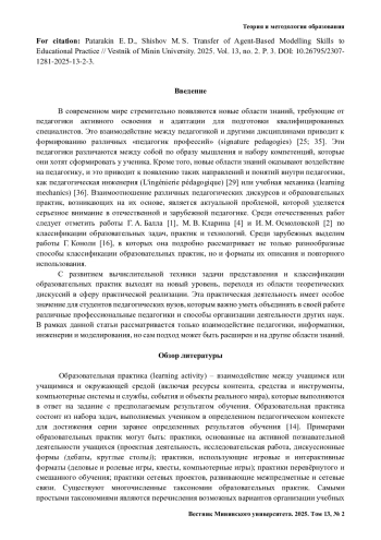 Результаты исследования. Применение дидактического подхода к инженерии, информатике и моделированию формирует профессиональные педагогики, нацеленные на развитие инженерного, вычислительного и модельного мышления. Инженерный подход к педагогике предполагает использование инженерных методов в образовательном процессе, а в вычислительной деятельности это проявляется в применении языков для создания диаграмм сценариев образовательных практик. Особое внимание уделяется взаимодействию дидактики и моделирования, формируя модельную дидактику, использующую многоагентное моделирование для проектирования образовательных практик, что позволяет студентам педагогических вузов эффективно проектировать и анализировать образовательные практики.