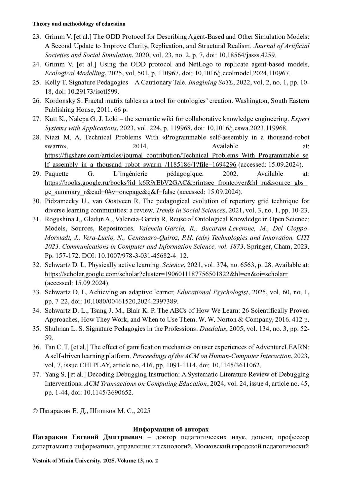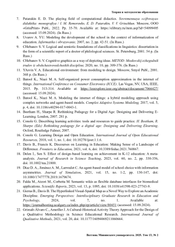 7. Патаракин Е. Д. Игровое поле вычислительной дидактики // Современная «цифровая» дидактика: монография / И. М. Реморенко, Е. Д. Патаракин, В. В. Гриншкун. М.: ООО «ГринПринт», 2022. С. 35-70. URL: https://elibrary.ru/item.asp?id=54099495 (дата обращения: 15.09.2024).