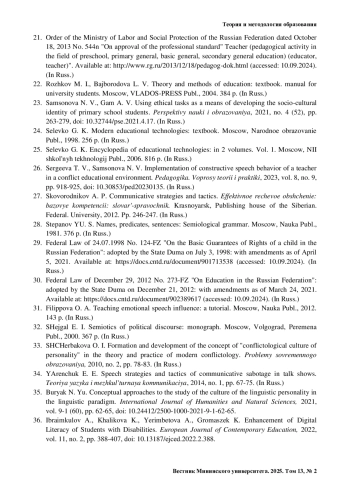 26. Сергеева Т. В., Самсонова Н. В. Реализация конструктивного речевого поведения педагога в конфликтной образовательной среде // Педагогика. Вопросы теории и практики. 2023. Т. 8, № 9. С. 918-925. https://doi.org/10.30853/ped20230135.