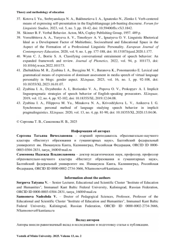 43. Zyubina I. A., Filippova M. Yu., Minakova N. A., Krivoshlykova L. V., Anikeeva I. G. Synchronous personal method of language studying speech behavior in implicit pragmalinguistics // XLinguae. 2020. Vol. 13, no. 4. Pp. 81-90. https://doi.org/10.18355/XL.2020.13.04.06.