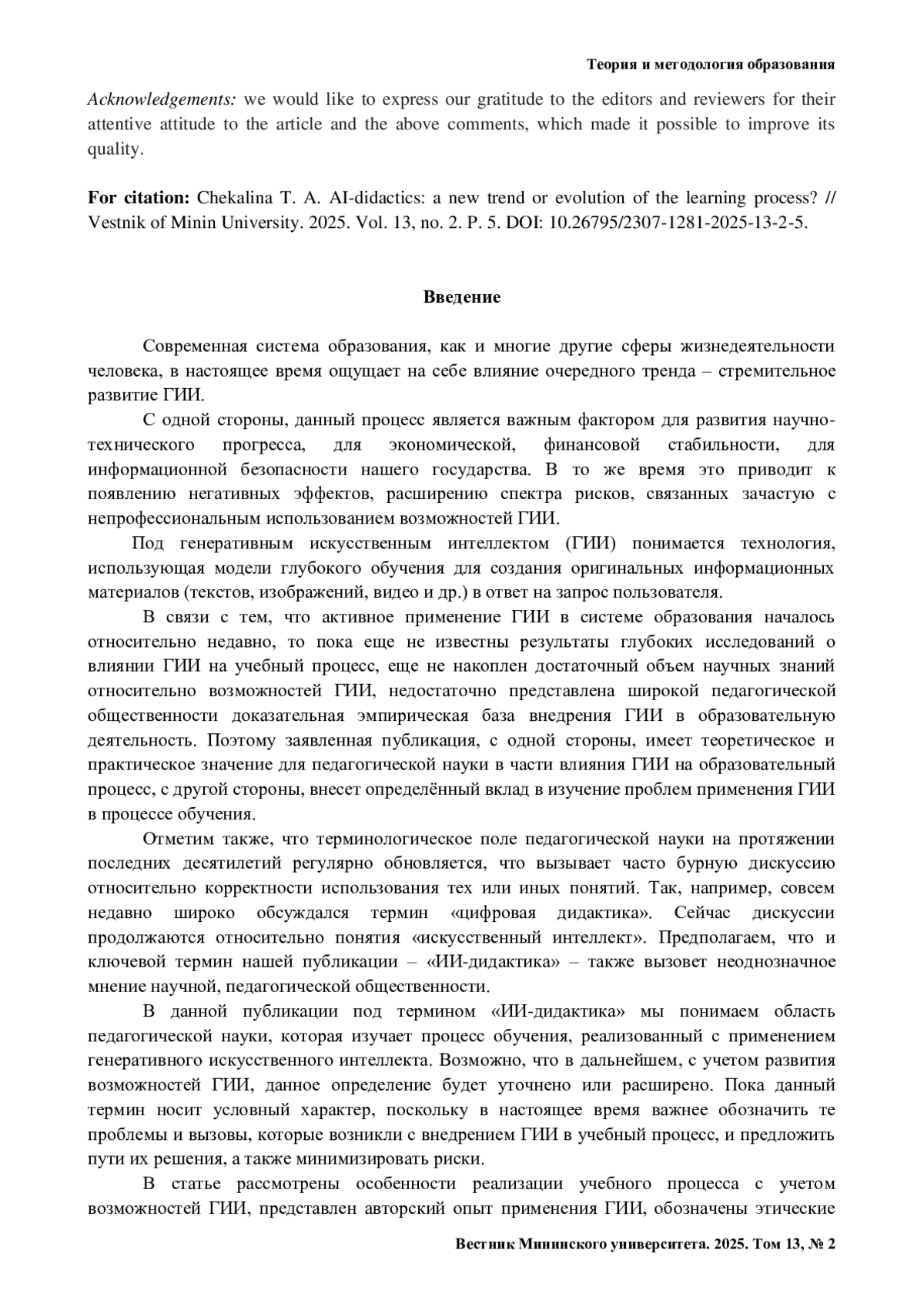 Обсуждение и заключения. В заключении автор обсуждает перспективы развития ИИ-дидактики и её влияние на будущее образования. Подчеркивается, что использование ГИИ может стать важным этапом в эволюции процесса обучения, способствуя его адаптации к изменяющимся условиям и потребностям современного общества.