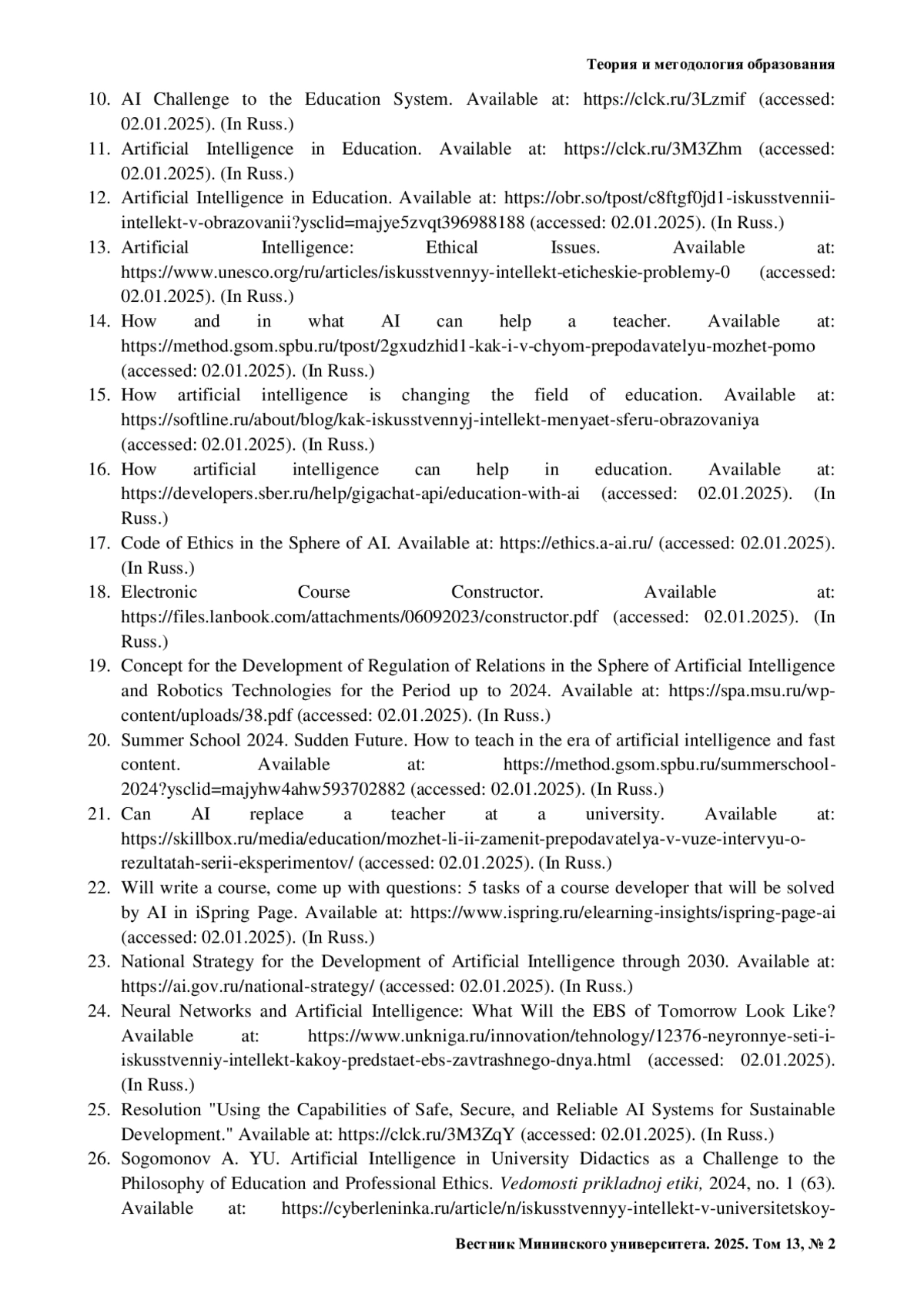 26. Согомонов А. Ю. Искусственный интеллект в университетской дидактике как вызов философии образования и профессиональной этике // Ведомости прикладной этики. 2024. № 1 (63). URL: https://cyberleninka.ru/article/n/iskusstvennyy-intellekt-v-universitetskoy-didaktike-kak-vyzov-filosofii-obrazovaniya-i-professionalnoy-etike (дата обращения: 02.01.2025).