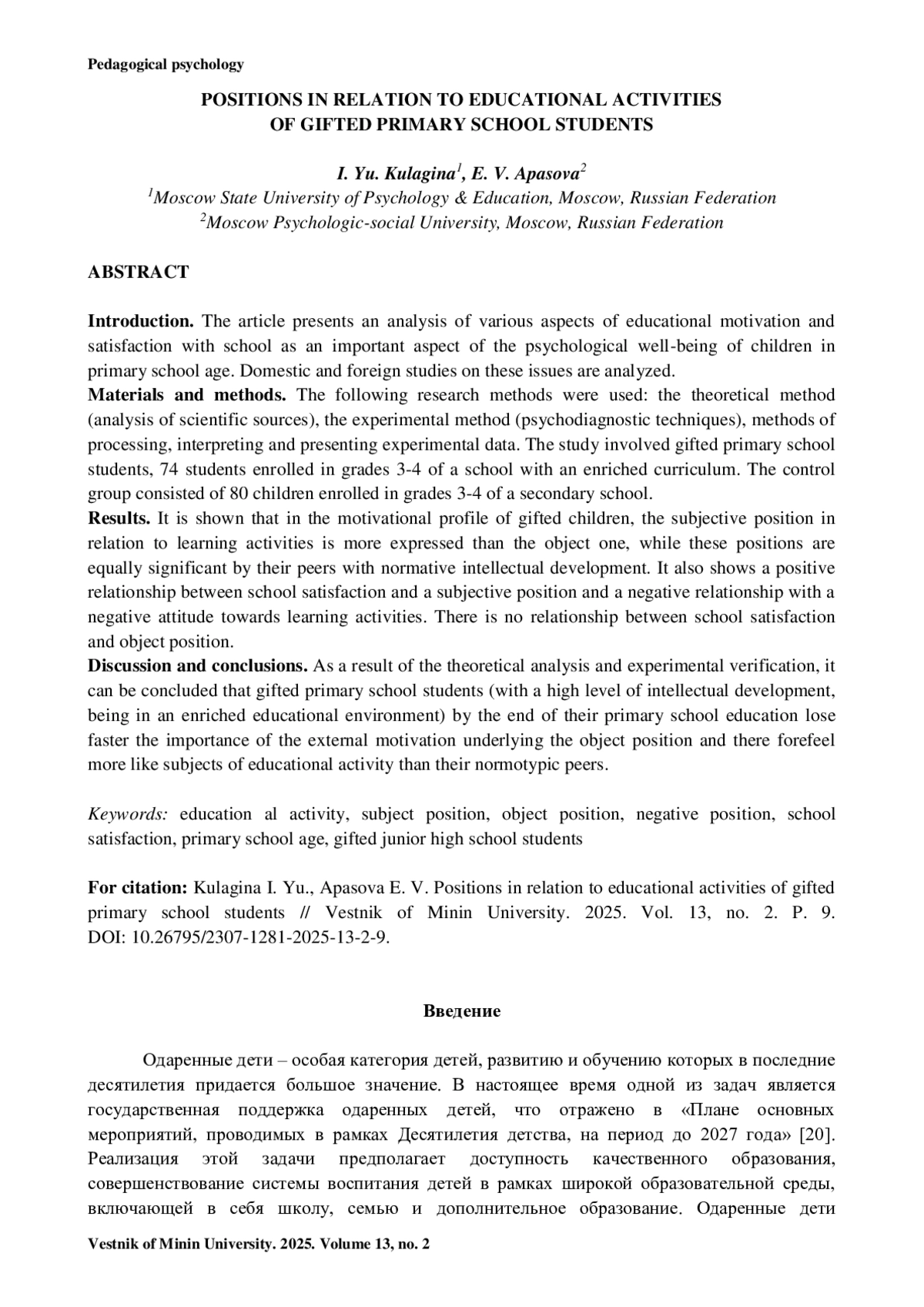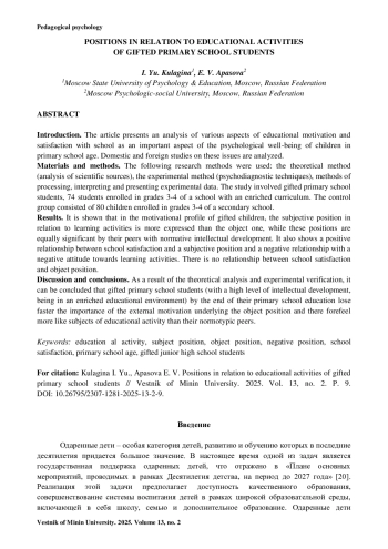 Результаты исследования. Показано, что в мотивационном профиле у одаренных детей в большей степени выражена субъектная позиция по отношению к учебной деятельности, чем объектная, в то время как у их сверстников с нормативным интеллектуальным развитием эти позиции равно значимы. Показана также положительная связь удовлетворенности школой с субъектной позицией и отрицательная – с негативной позицией по отношению к учебной деятельности. Не выявлена связь удовлетворенности школой с объектной позицией.