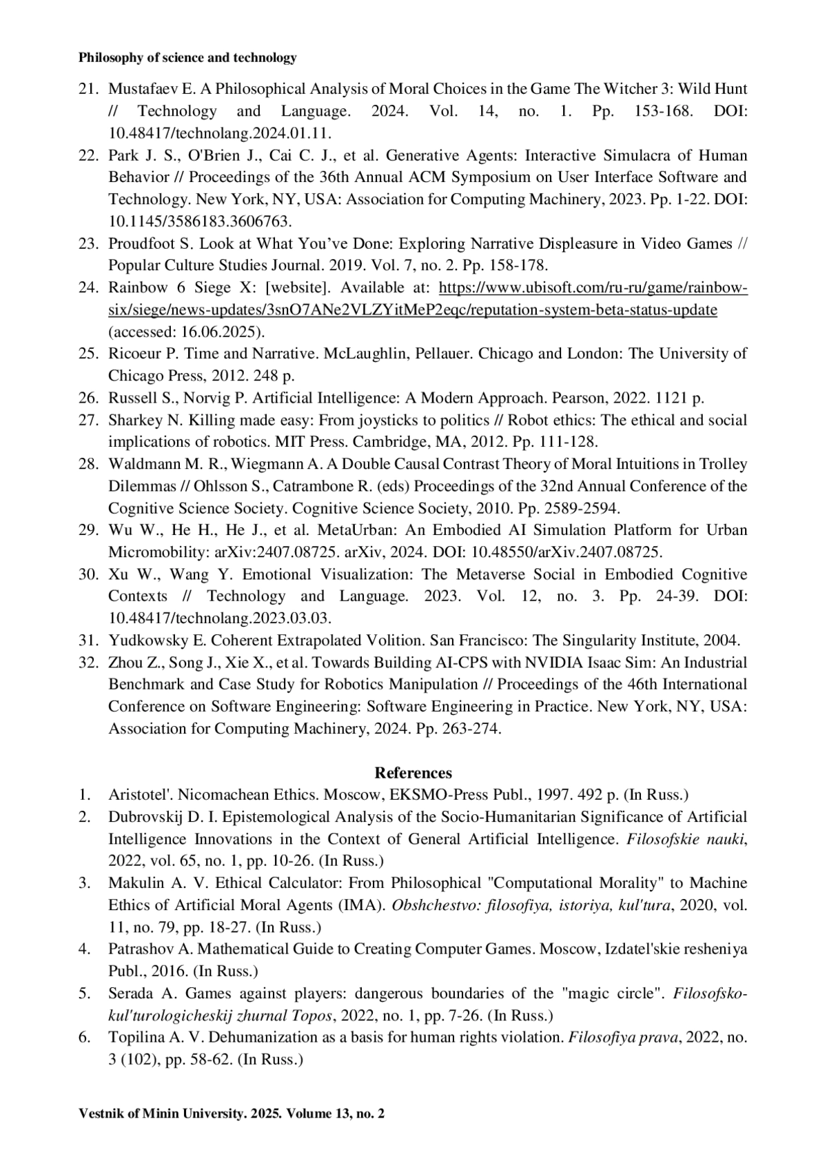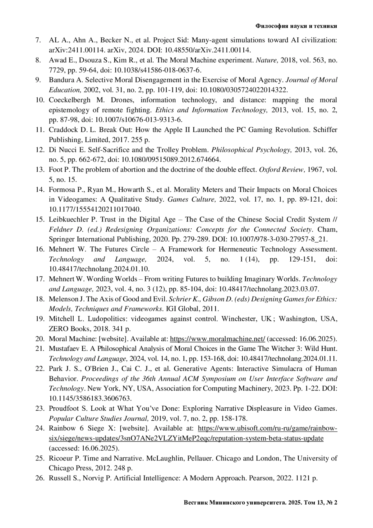 14. Formosa P., Ryan M., Howarth S., et al. Morality Meters and Their Impacts on Moral Choices in Videogames: A Qualitative Study // Games Culture. 2022. Vol. 17, no. 1. Pp. 89-121. https://doi.org/10.1177/15554120211017040.