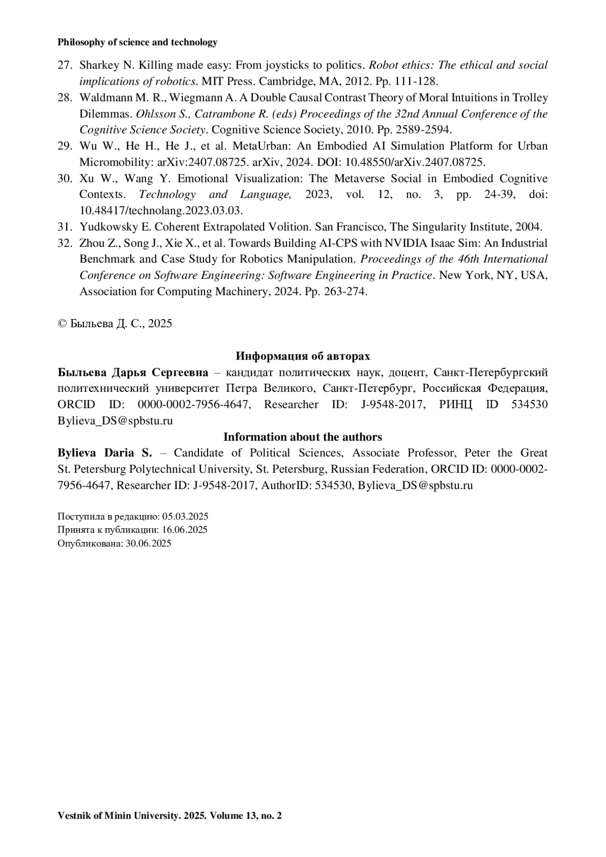 Обсуждение и заключения. Существующая неопределенность в оценке морали подчас служит основанием для предположения о роли искусственного интеллекта в построении моральной системы на основании противоречивых и неполных данных, однако в этом случае мы возвращаемся к модели, в которой моральная оценка передана возвышающейся над реальностью сущности, в качестве которой выступает искусственный интеллект.