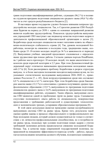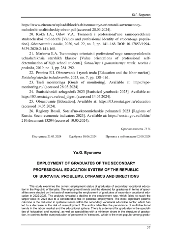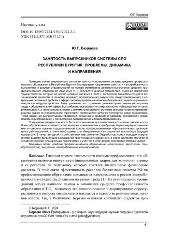 Проведен анализ современного состояния занятости выпускников системы среднего профессионального образования в Республике Бурятия. Исследованы направления занятости и востребованность выпускников в разрезе специальностей на основе мониторинга занятости выпускников среднего профессионального образования 2022-2023 гг. В результате анализа установлено снижение показателя трудоустройства, который не достиг целевого значения в 2023 г. вследствие значительного роста потенциальной занятости. В качестве основного положительного результата, свидетельствующего о сокращении системных проблем в сфере среднего профессионального образования, выделено уменьшение рисков нетрудоустройства. Автор указывает на сохранение разновекторных тенденций на рынке труда и образовательной сфере. Востребованы выпускники по специальностям «образование» и «сестринское дело», а также специальностям с минимальной долей в структуре выпуска на фоне перепроизводства кадров по специальности «транспорт», являющейся наиболее популярной среди выпускников. Также среди них распространены профессии, связанные с сервисом и туризмом, экономикой и управлением, юриспруденцией и техносферной безопасностью и природопользованием. Полученные результаты могут быть использованы при выявлении возможных рисков и проблем, обусловленных незанятостью молодых специалистов и требующих первоочередного внимания со стороны органов государственной власти, профессиональных образовательных организаций и работодателей, а также необходимы для абитуриентов и их родителей при выборе будущей профессии. В качестве одной из действенных мер снижения безработицы среди молодых специалистов видится дальнейшее расширение практикоориентированного, а также целевого обучения и создания условий, поощряющих предприятия к участию в этой форме подготовки рабочих кадров.