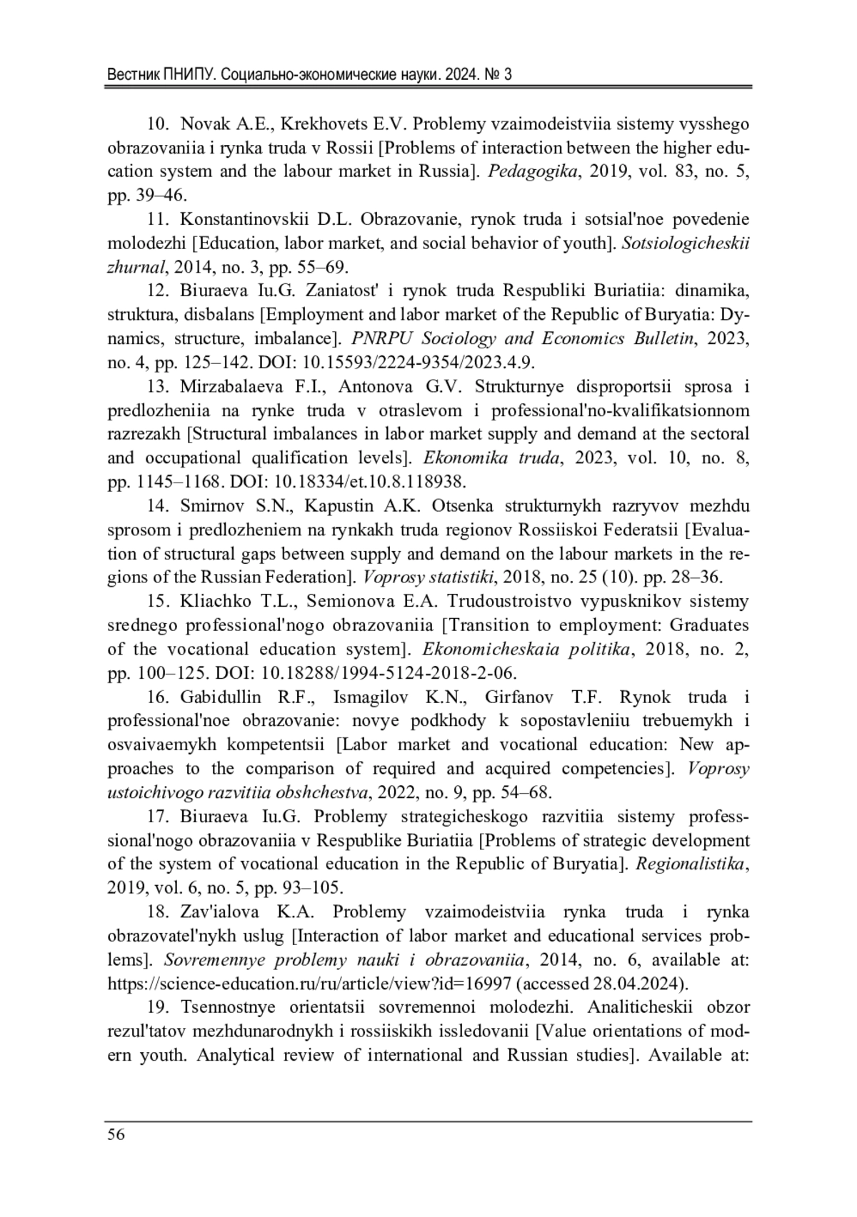 10. 	Новак, А.Е. Проблемы взаимодействия системы высшего образования и рынка труда в России / А.Е. Новак, Е.В. Креховец // Педагогика. - 2019. - Т. 83, № 5. - С. 39-46.