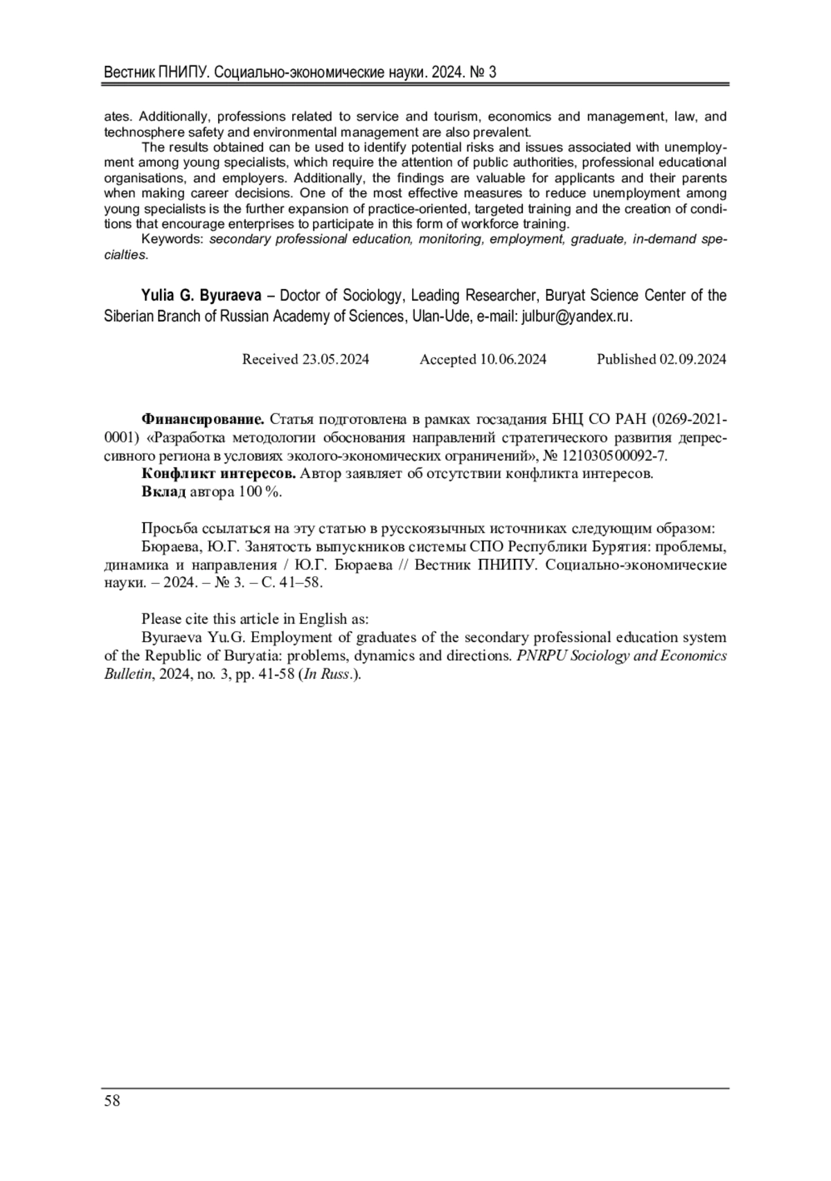 12. 	Бюраева, Ю.Г. Занятость и рынок труда Республики Бурятия: динамика, структура, дисбаланс / Ю.Г. Бюраева // Вестник Пермского национального исследовательского политехнического университета. Социально-экономические науки. - 2023. - № 4. - С. 125-142.  DOI: 10.15593/2224-9354/2023.4.9  EDN: REOTTX