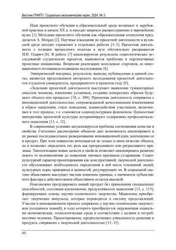 Исследуются социальные и культурные условия интеграции проектного подхода в университетский образовательный и научно-исследовательский процесс. Выводы авторов опираются на результаты проведенного социологического исследования методом сплошного анкетного online опроса студентов 1-4 курсов Уфимского университета науки и технологий, принимающих участие в инновационных проектах. Задачами исследования выступают: выявление отношения студентов к выделенным ключевым факторам успешности инновационных проектов и их готовности учитывать эти факторы в своей будущей проектной деятельности; определение влияния профессионально-трудовой ориентации студентов на отношение к ключевым факторам успешного осуществления инновационных проектов; обоснование и разработка средств и форм развития культуры взаимодействия участников студенческой проектной деятельности в университете. В ходе исследования использовался комплекс индикаторов, описывающих ключевые факторы успешного осуществления инновационных студенческих проектов и измеряющих с помощью шкалы Р. Лайкерта восприятие респондентами этих факторов. Авторы предлагают организовать проектное взаимодействие в следующих направлениях: обеспечение обучения студентов инженерных специальностей основам проектно-управленческой деятельности; получение студентами обязательных навыков командной работы над реальными проектами; ориентация подготовки студентов, в том числе и инженерных специальностей, на развитие личной предпринимательской инициативы; корреляция мер поддержки студенческих инновационных проектов, предоставляемых университетами, с профессионально-трудовой ориентацией студентов. Сделан вывод, что взаимодействие в проектировании имеет духовно-коммуникационную природу, поэтому необходима разработка технологий, средств понимания и взаимопонимания участников, что предполагает подключение культурно-интеллектуального потенциала социума. Указанный подход к проектированию предполагает учет технологии творчества, а также не только рационального, но и морального фактора выбора решений. Проектирование должно включать конструирование оптимального удовлетворения потребностей субъектов преобразовательной деятельности, прогнозирование и оценку последствий управленческих, технических решений при определенном комплексе социальных и культурных условий. Применение коммуникационных средств и форм взаимодействия в студенческой проектной деятельности позволяет формировать компетентного, мотивированного и инициативного конструктора, технолога и проектного менеджера в соответствующих профессиональных отраслях.