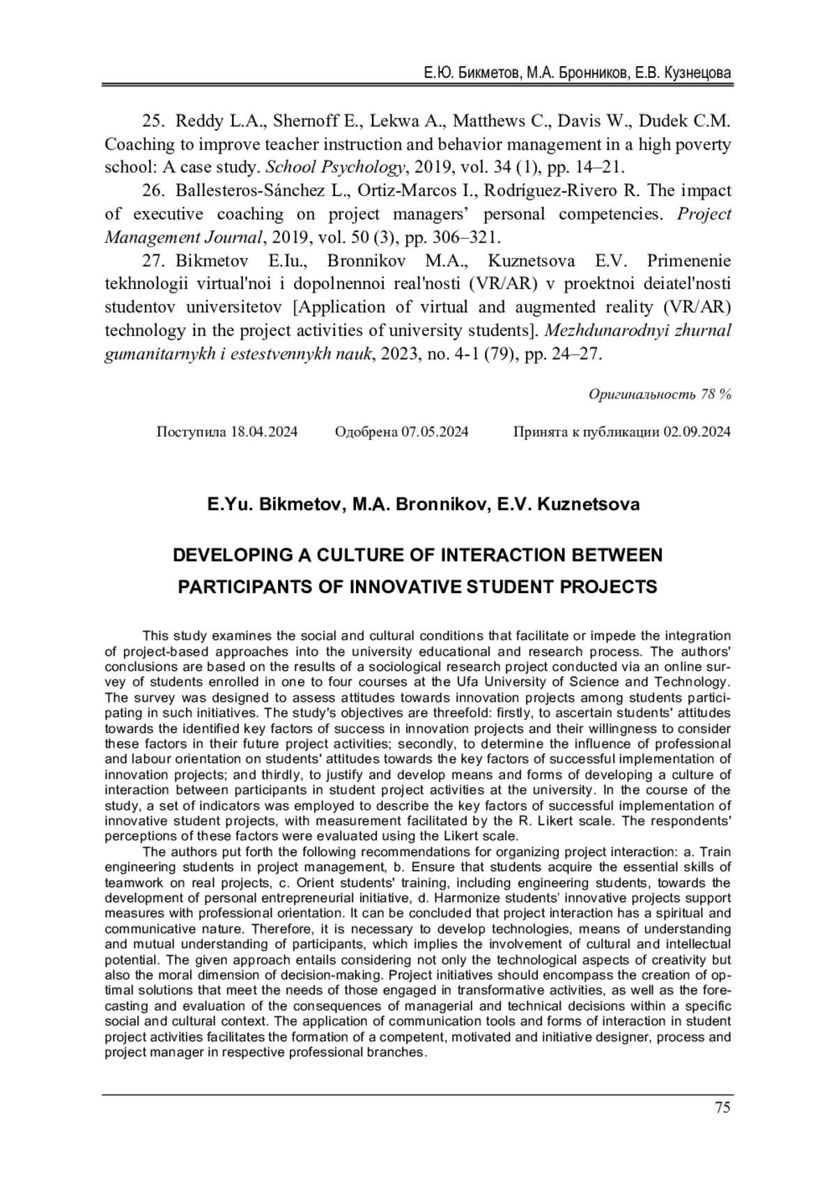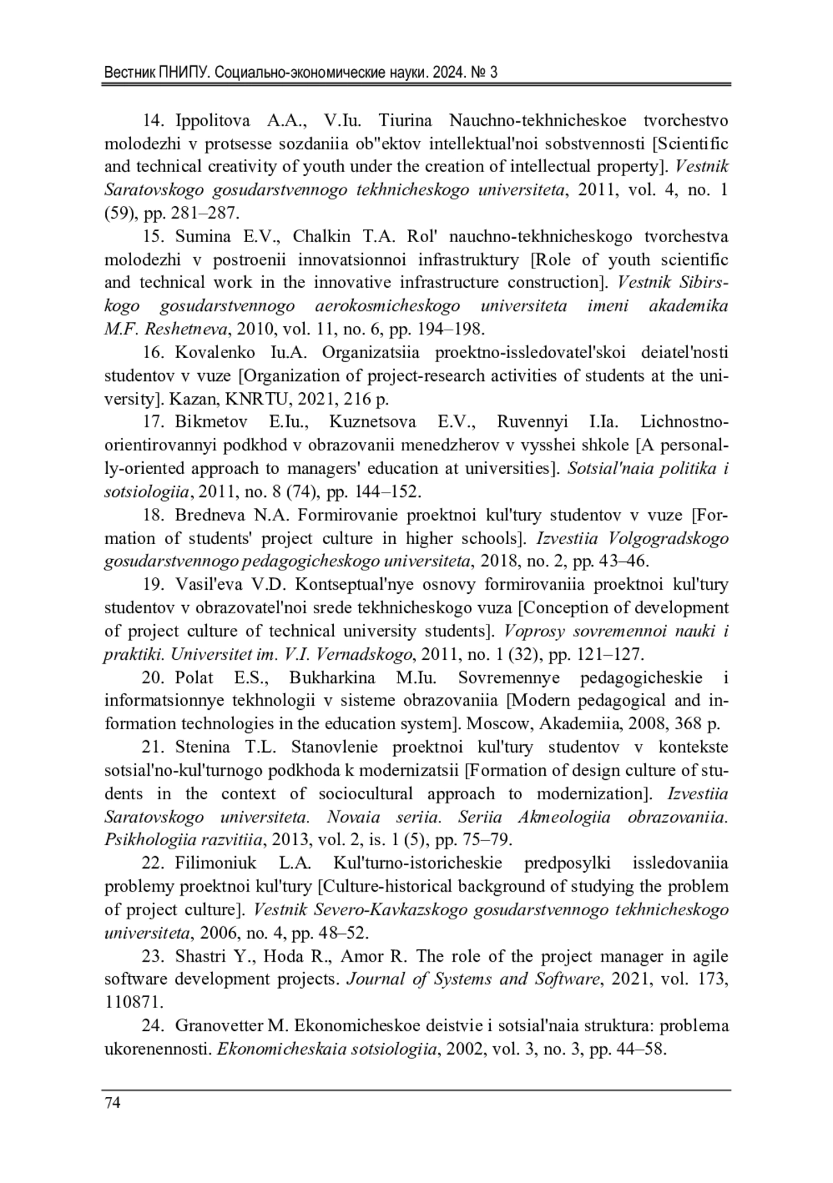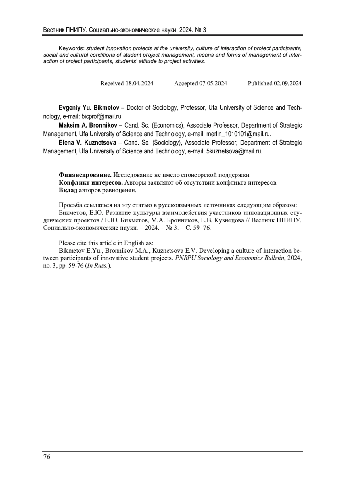 9. 	Бикметов, Е.Ю. Организационные, методические и мотивационные аспекты управления студенческими инновационными проектами / Е.Ю. Бикметов, М.А. Бронников, Е.В. Кузнецова // Вестник Пермского национального исследовательского политехнического университета. Социально-экономические науки. - 2023. - № 4. - С. 21-37.  EDN: OCISCL