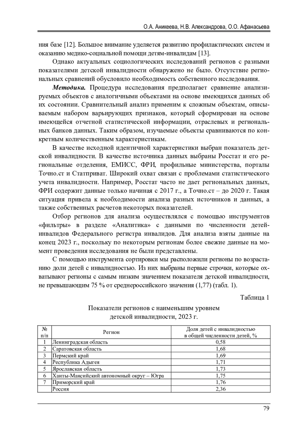 Представлены результаты авторского сравнительного исследования ряда социальных, экономических, медицинских и других показателей регионов Российской Федерации, в которых доля детей с инвалидностью в общем числе детей является наименьшей по стране (к таким регионам отнесены Пермский, Приморский края, Ленинградская, Саратовская, Ярославская области, Республика Адыгея, Ханты-Мансийский автономный округ - Югра). Авторы предпринимают попытку выделить совпадающие показатели, которые могут оказывать влияние на низкий уровень детской инвалидности в регионе. Определение общих показателей необходимо для проверки гипотезы о том, что они могут являться факторами снижения уровня детской инвалидности и в других регионах Российской Федерации. Воздействие на выявленные показатели будет способствовать сокращению уровня инвалидизации и численности детей с инвалидностью в стране. Выводы авторов показывают наличие некоторых общих показателей, отличающихся от средних значений по Российской Федерации. К ним авторы относят демографические (уровень разводимости), медицинские (уровень общей заболеваемости и заболеваемости онкологическими болезнями, уровень младенческой смертности), экономические (доля расходов в региональном бюджете на здравоохранение), а также экологические (статус региона) показатели. В то же время уровень детской инвалидизации не связан с размером региона, его экономическим развитием и численностью его населения, а также с заключением браков, уровнем рождаемости и смертности в регионе. Важным выводом является заключение об отсутствии связи с распространенностью психических заболеваний, алкоголизацией, ЗОЖ и продолжительностью жизни в регионе. Авторы также подвергают сомнению одну из наиболее вероятных гипотез о том, что регионы с низкой инвалидизацией имеют более высокие расходы на социальную политику и устанавливают большее количество социальных выплат. Полученные авторами результаты обусловливают необходимость масштабных сравнительных исследований совокупности показателей экономики и сфер здравоохранения регионов Российской Федерации с разным уровнем детской инвалидизации.