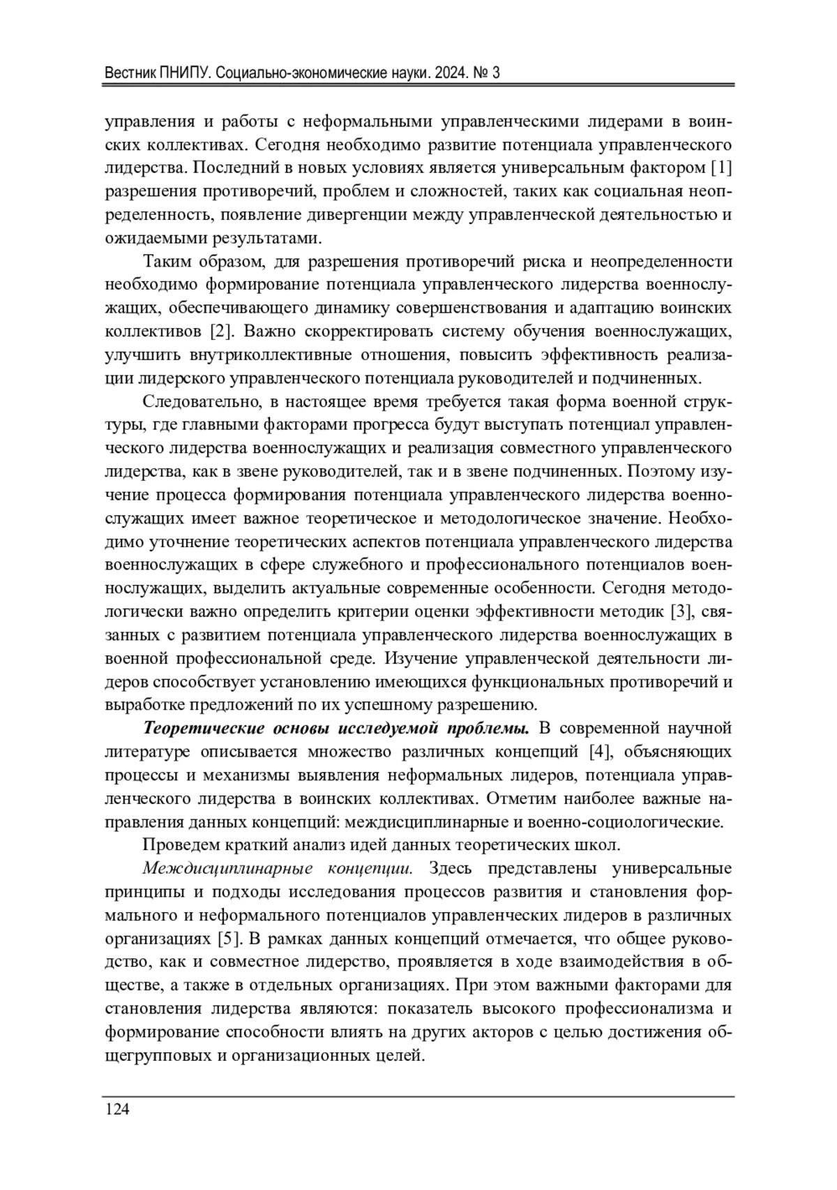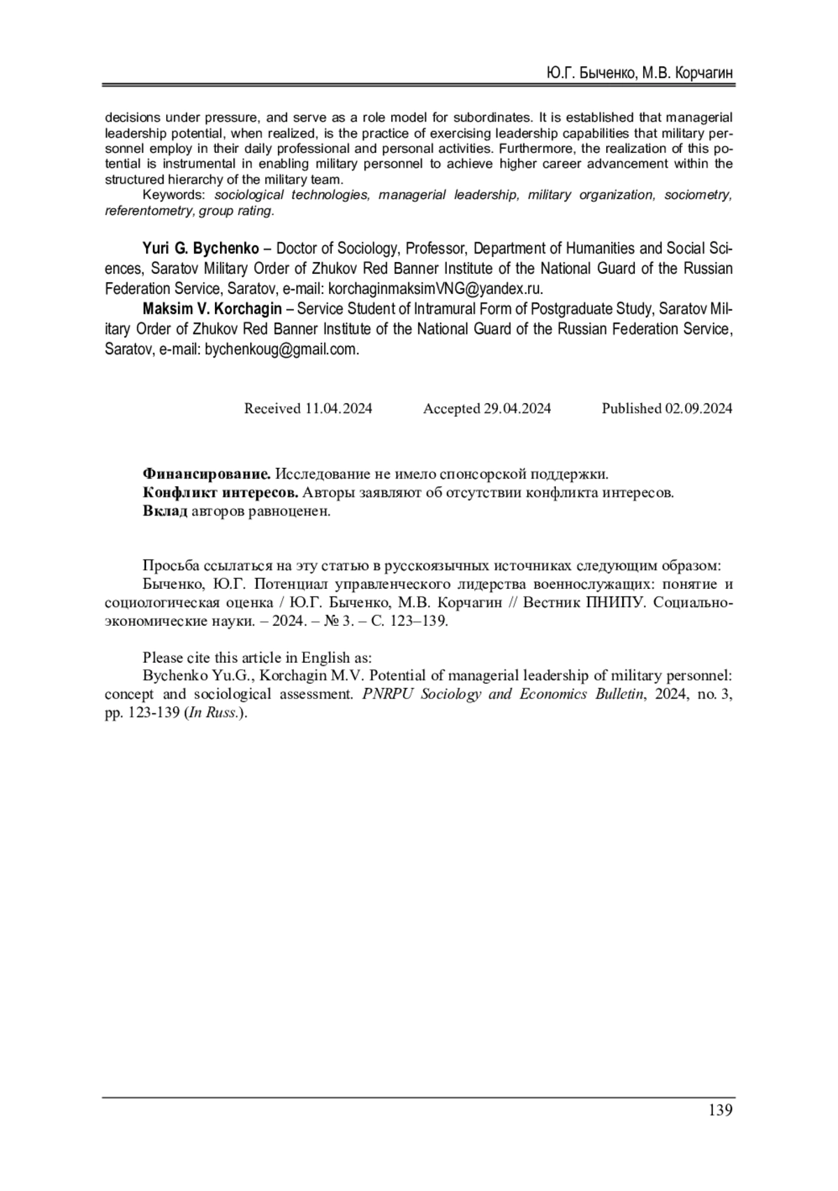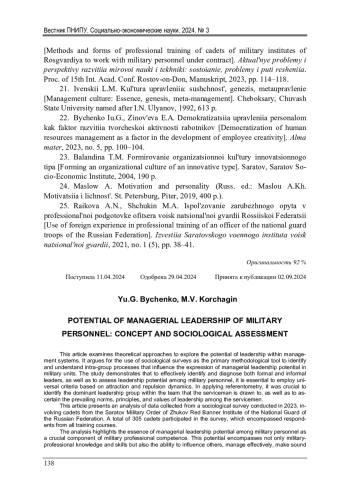 Проведен анализ теоретических подходов, рассматривающих потенциал лидерства в системе управленческих отношений. Обоснована необходимость применения социологического опроса в качестве основного методологического инструментария для определения внутриколлективных процессов проявления потенциала управленческого лидерства в воинских подразделениях. Доказывается, что для своевременного выявления и диагностирования формальных и неформальных управленческих лидеров, а также определения лидерского управленческого потенциала у членов воинского коллектива необходимо применение универсальных критериев, основанных на атракции и репульсии. При применении референтометрии было важно выделение доминирующей лидерской группы в коллективе, к которой тяготеет военнослужащий, определить систему преобладающих разделяемых управленческих норм, принципов, ценностей военнослужащих. Проведен анализ данных полученных социологическим опросом, где респондентами выступили курсанты Саратовского военного ордена Жукова Краснознаменного института войск национальной гвардии Российской Федерации, г. Саратов, 2023 г. Опрошено 305 курсантов, охват респондентов проведен на всех курсах обучения. В результате анализа уточнена сущность потенциала управленческого лидерства военнослужащих как формы военного профессионального потенциала, который включает в себя не только военно-профессиональные знания, умения, навыки, но и способность влиять на людей, эффективно управлять ими, принимать решения в сложных ситуациях и быть примером для подражания подчиненных. Доказано, что потенциал управленческого лидерства как процесс представляет собой практику реализации лидерских способностей, где осуществляется их применение военнослужащими в повседневной профессиональной и бытовой деятельности. Процесс реализации потенциала управленческого лидерства способствует занятию военнослужащим более высокого карьерного положения, его продвижению по специфичной системе подчинения воинского коллектива.