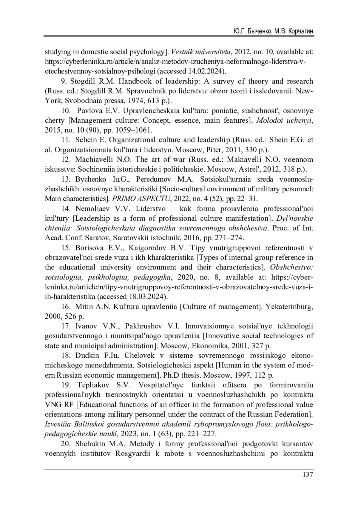 13. 	Быченко, Ю.Г. Социокультурная среда военнослужащих: основные характеристики / Ю.Г. Быченко, М.А. Передумов // PRIMO ASPECTU. - 2022. - № 4 (52). - С. 22-31.