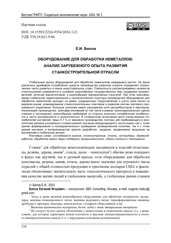 Глобальный рынок оборудования для обработки неметаллов непрерывно растет. На фоне различных драйверов потребления средств производства развитие отрасли определяет ограниченное число развитых и новых индустриальных стран. Совокупность рассматриваемых сегментов станкостроения развивается в условиях разнообразия государственных мер поддержки производителей, включая маркетинговые, и разнообразия корпоративных стратегий. При этом трансформация глобальной территориальной и технологической структуры производства оборудования для обработки неметаллов выходит за рамки традиционных представлений о росте доли Китая на мировом рынке, доминировании станкостроительных кластеров и развитии систем числового программного управления. Большое значение имеет расширение сети дистрибьюторов и партнеров, локализация производства, трансфер инноваций (в том числе в рамках транснациональных сделок слияния и поглощения), разнообразие требований со стороны конечных потребителей (особенности в части экономичности и экологичности). В стоимостном исчислении доля отечественных потребителей составляет лишь 0,1 % от мирового производства, поэтому для пребывающего в многолетнем кризисе российского станкостроения изучение международного опыта важно как с точки зрения формирования и последовательного проведения промышленной политики, так и с точки зрения изучения и воспроизводства практик разработки, создания, продвижения продукции на внутреннем и глобальном рынках.