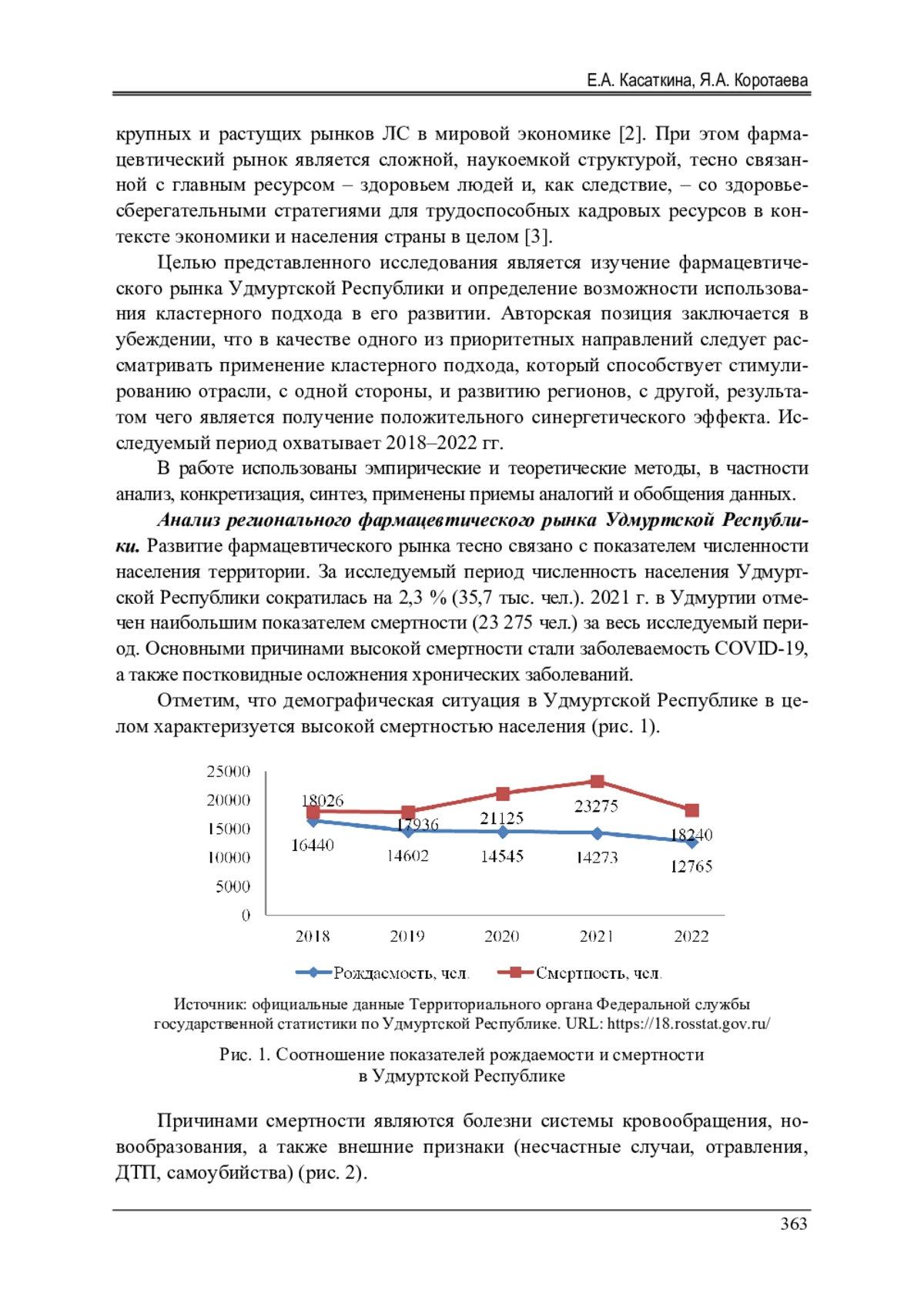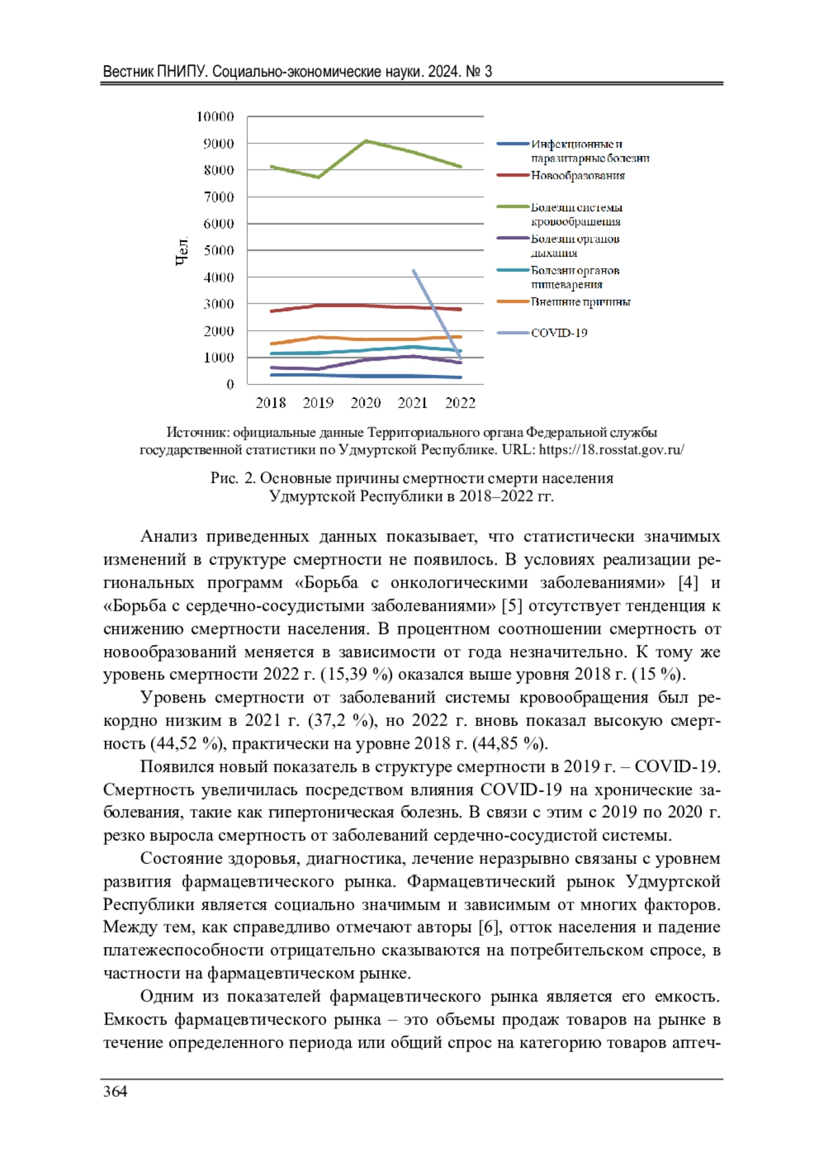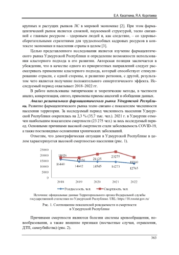 Исследованы данные о состоянии фармацевтического рынка Удмуртской Республики. Авторами изучены демографические показатели в динамике. На основании официальных данных приведены цифры о соотношении показателей рождаемости и смертности в регионе. Сформулирован вывод о высоком уровне смертности, представлены основные причины. В исследовании отражены данные о динамике и последствиях для изменения хронических заболеваний пандемии COVID-19. Авторами отмечено, что состояние здоровья, диагностика, лечение неразрывно связаны с уровнем развития фармацевтического рынка. На основе изучения аналитических данных установлено, что несмотря на увеличение емкости фармацевтического рынка Удмуртской Республики, в натуральном выражении появилась тенденция к снижению, так как вырос спрос на импортные препараты, не имеющие отечественных аналогов. В результате изучения источников отмечено, что в стране сохраняется актуальность проблемы доступности качественных лекарственных препаратов. На основе изучения открытых исследований представлен вывод о постепенном увеличении доли отечественной продукции на фармацевтических рынках. Проанализированы количественные показатели государственных и частных аптечных организаций, получен вывод о преобладании негосударственной формы собственности. Особенное внимание в работе авторы акцентируют на том факте, что фармацевтический рынок Удмуртской Республики не богат отечественными предприятиями - производителями лекарственных препаратов. При этом отмечается преобладание негосударственных организаций в данном сегменте. Сформулировано авторское мнение о том, что одним из действенных инструментов развития регионального фармацевтического рынка республики может стать формирование территориально-производственных кластеров. В заключение определены потенциально возможные элементы кластера (базовые производственные мощности, виды препаратов, основные организации).