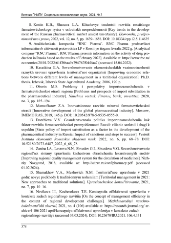 13. 	Доржиева, В.В. Государственная политика импортозамещения как фактор развития фармацевтической промышленности России: влияние санкций и шаги к успеху / В.В. Доржиева // Вестник Института экономики Российской академии наук. - 2022. - № 6. - C. 68-78.  DOI: 10.52180/2073-6487_2022_6_68_78  EDN: PXZQFD