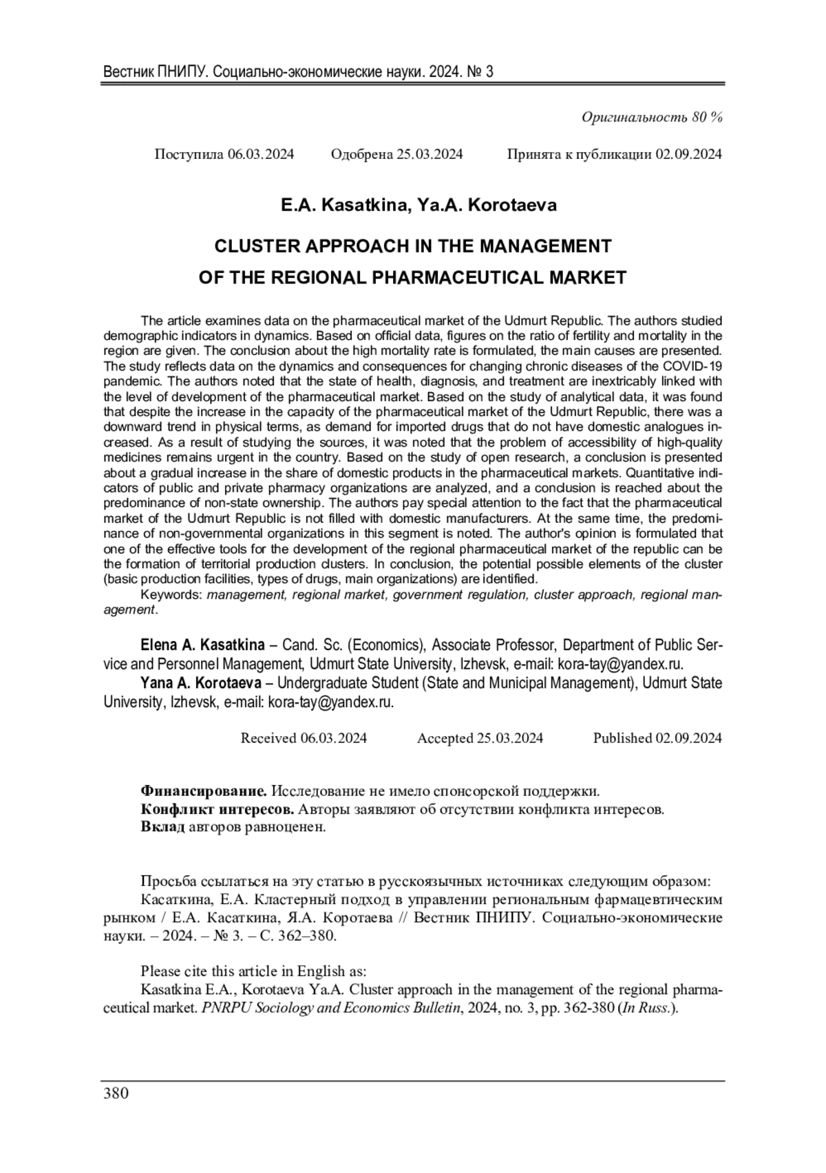 1. 	Пискунова, Л.П. Современные тенденции развития фармацевтического рынка: Россия и Казахстан / Л.П. Пискунова, Ю.А. Санникова // Российские регионы в фокусе перемен: сб. докл. со спец. мероприятий XII Междунар. конф. - Екатеринбург: Изд-во УМЦ УПИ, 2018. - С. 242-248.  EDN: ZDMIHR