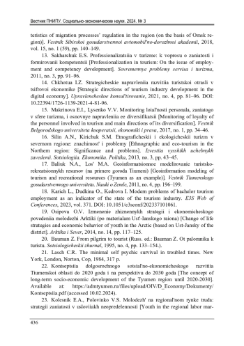 18. 	Karich, L. Modern problems of bachelor tourism employment as an indicator of the state of the tourism industry / L. Karich, O. Dudkina, I. Kedrova // E3S Web of Conferences. - 2023. - Vol. 371.  DOI: 10.1051/e3sconf/202337101061  EDN: LJMTLB