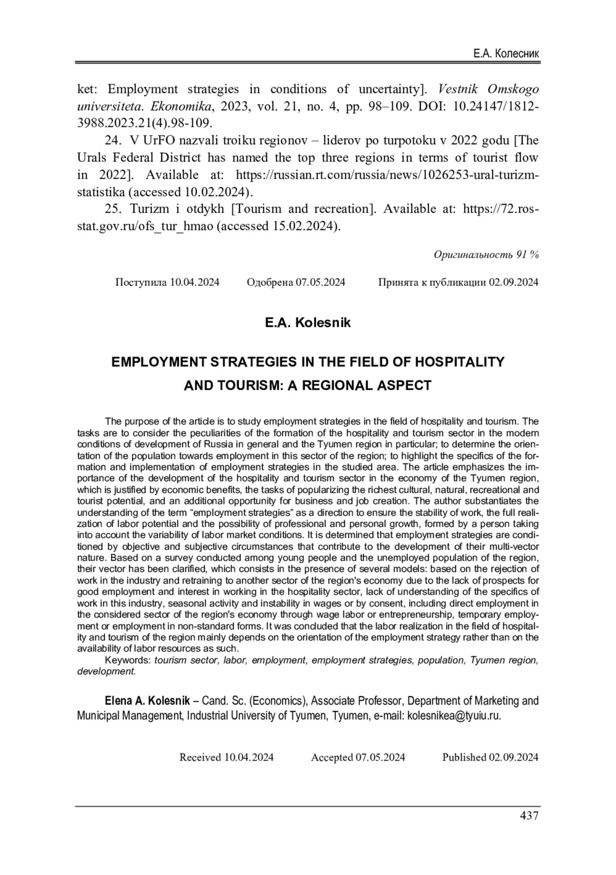 Проведен анализ стратегий занятости населения в сфере гостеприимства и туризма. Рассмотрены особенности формирования сферы гостеприимства и туризма в современных условиях развития России вообще и Тюменской области в частности. Определена направленность населения на занятость в данном секторе региона. Выделена специфика формирования и реализации стратегий занятости в изучаемой сфере. Подчеркивается значимость развития сферы гостеприимства и туризма в экономике Тюменской области, которая обосновывается экономическими выгодами, задачами популяризации богатейшего культурного, природного, оздоровительного и туристического потенциала, и дополнительной возможностью для бизнеса и создания рабочих мест. Обосновано понимание термина «стратегии занятости населения» как направление обеспечения стабильности трудовой деятельности, полной реализации трудового потенциала и возможности профессионального и личностного роста, формируемые личностью с учетом изменчивости конъюнктуры рынка труда. Определено, что стратегии занятости обусловливаются объективными и субъективными обстоятельствами, способствующими развитию их разновекторности. На основании проведенного опроса среди молодежи и безработного населения области уточнена их векторность, заключающаяся в наличии нескольких моделей: основанной на отказе от трудореализации в отрасли и переквалификации на другой сектор экономики региона из-за отсутствия перспектив хорошего трудоустройства и интереса к работе в сфере гостеприимства, недостаточности понимания специфики работы в данной отрасли, сезонностью деятельности и нестабильностью в оплате труда или на согласии, включающем непосредственную занятость в рассматриваемом секторе экономики региона через наемный труд или предпринимательство, временную занятость или занятость в нестандартных формах. Был сделан вывод о том, что трудореализация в сфере гостеприимства и туризма области зависит не столько от наличия трудовых ресурсов, сколько от направленности стратегии занятости.