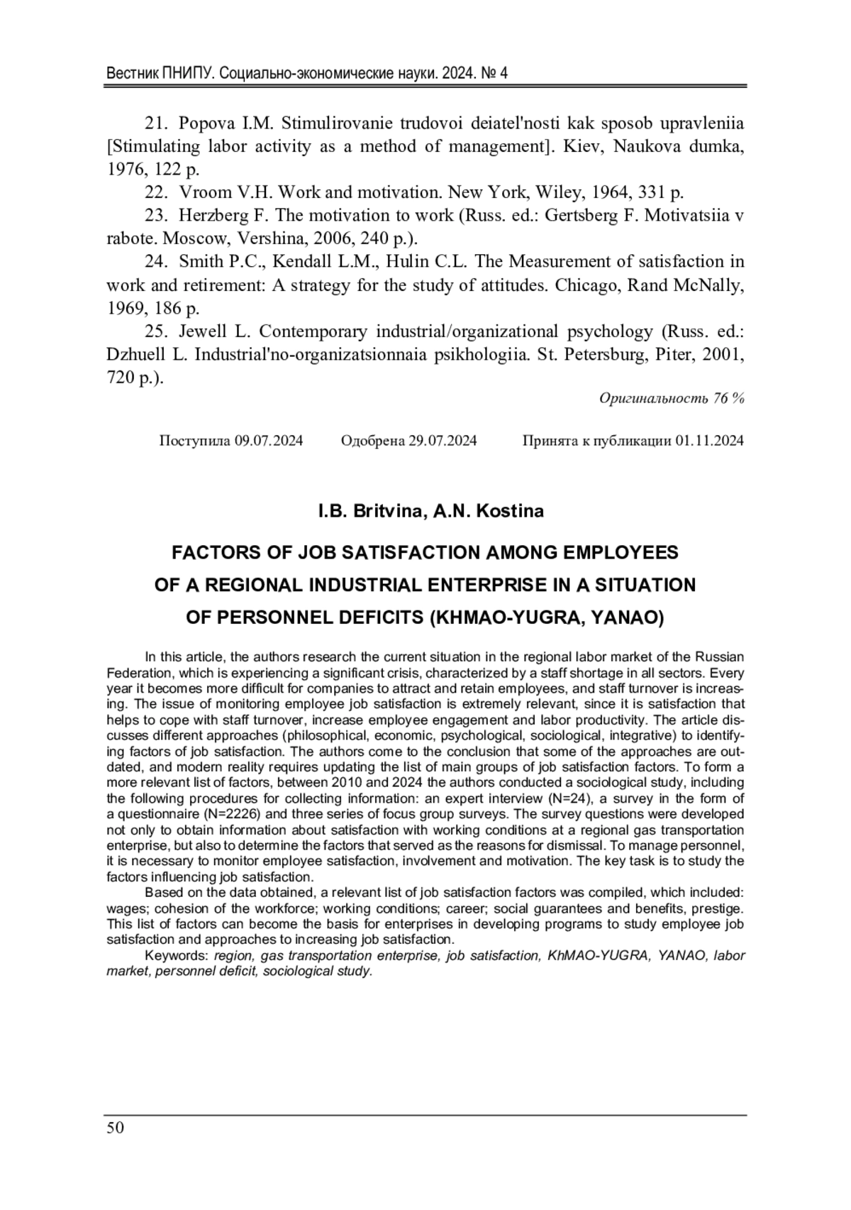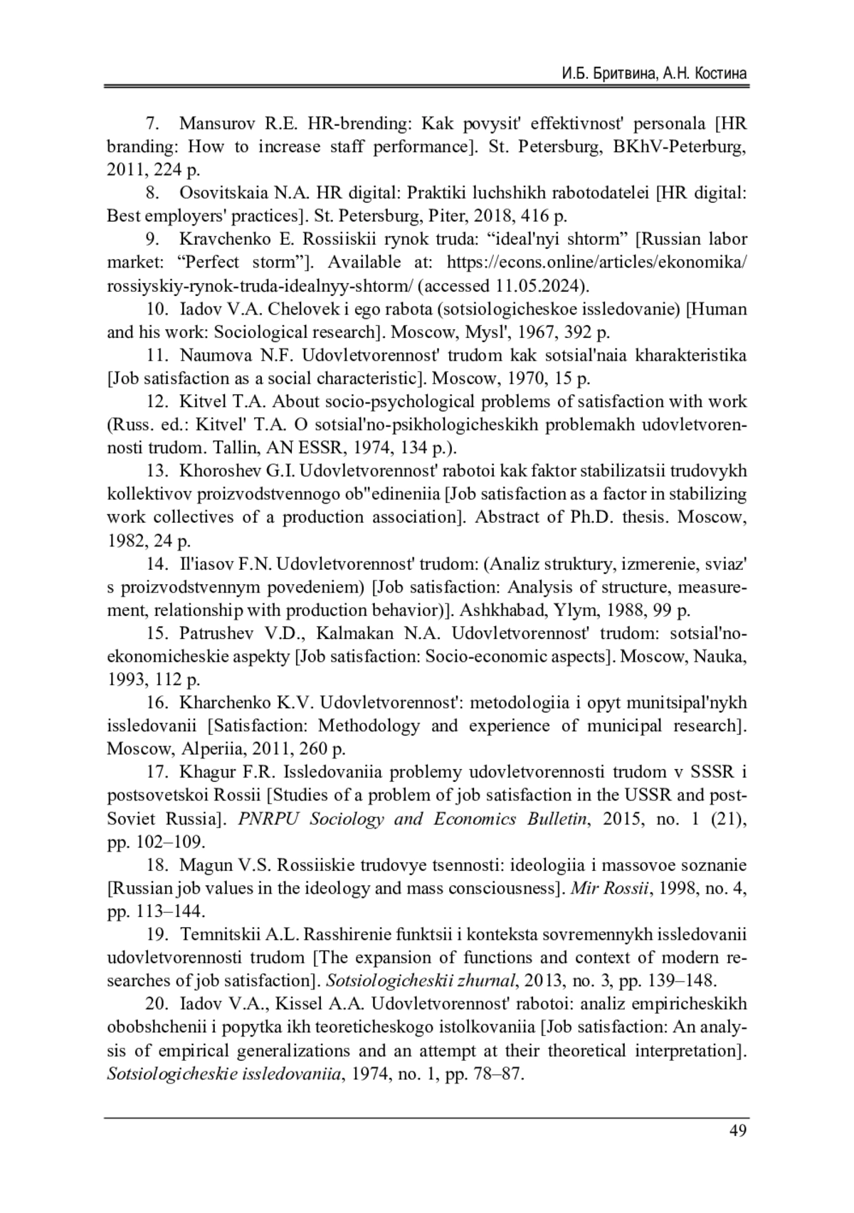 20. Ядов, В.А. Удовлетворенность работой: анализ эмпирических обобщений и попытка их теоретического истолкования / В.А. Ядов, А.А. Киссель // Социологические исследования. - 1974. - № 1. - С. 78-87. EDN: TAUURX