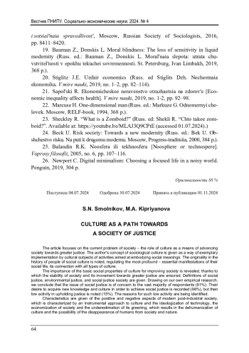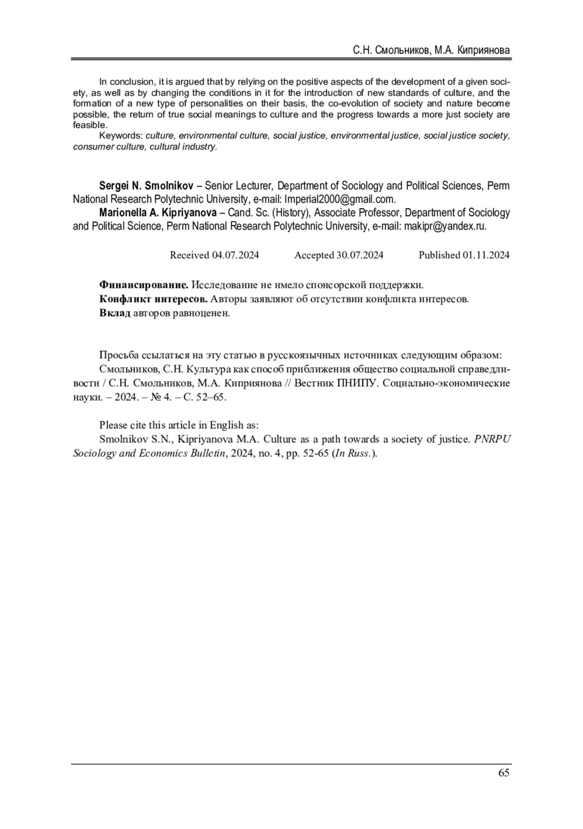 2. 	Киприянова, М.А. Искажение смыслов культуры в условиях ее технологизации / М.А. Киприянова, С.Н. Смольников // Ученые записки Крымского федерального университета имени ВИ Вернадского. Философия. Политология. Культурология. - 2023. - Т. 9, № 2. - С. 68-80.  EDN: XNORQZ