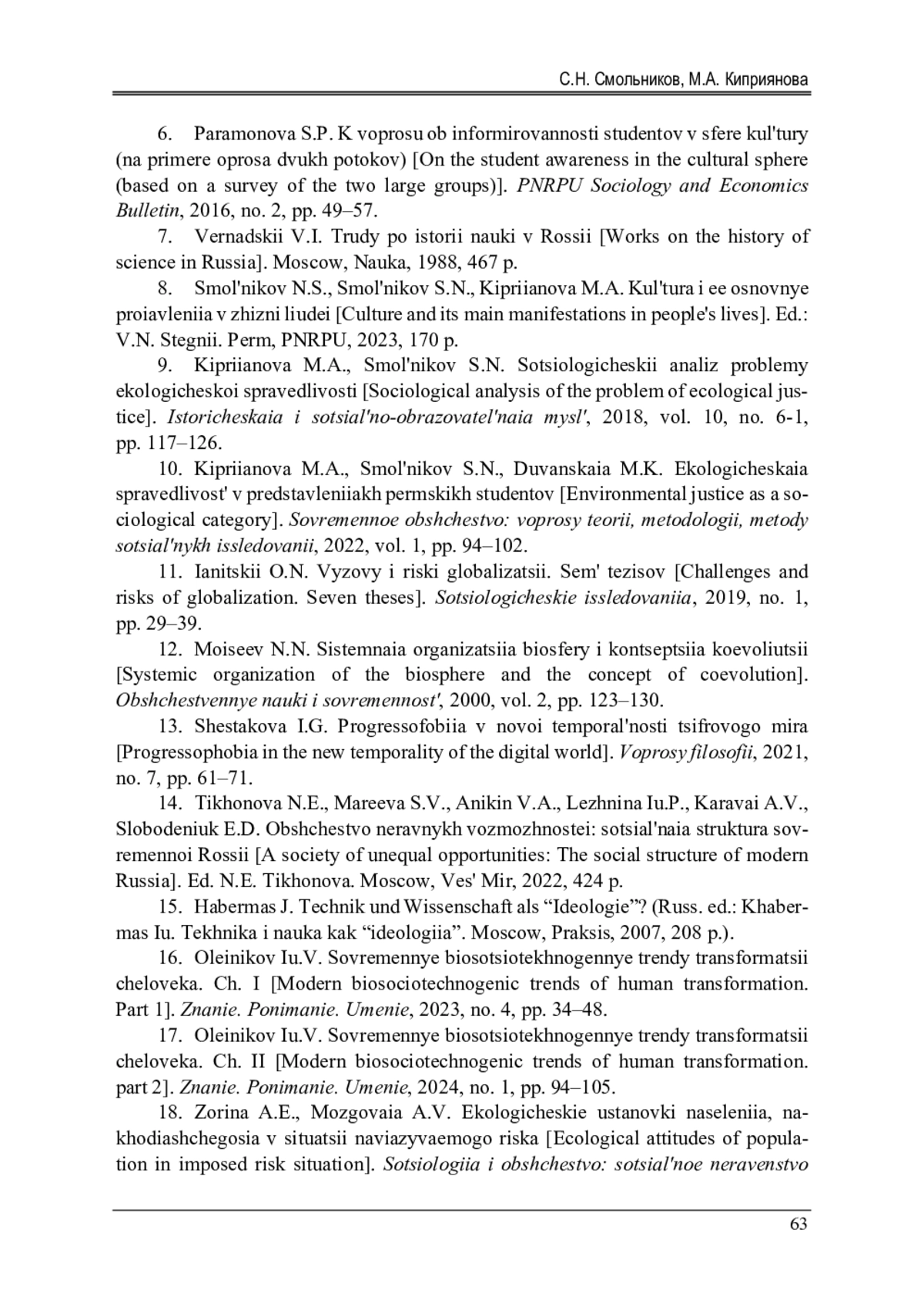 10. 	Киприянова, М.А. Экологическая справедливость в представлениях пермских студентов / М.А. Киприянова, С.Н. Смольников, М.К. Дуванская // Современное общество: вопросы теории, методологии, методы социальных исследований. - 2022. - Т. 1. - С. 94-102.  EDN: LRFOCE