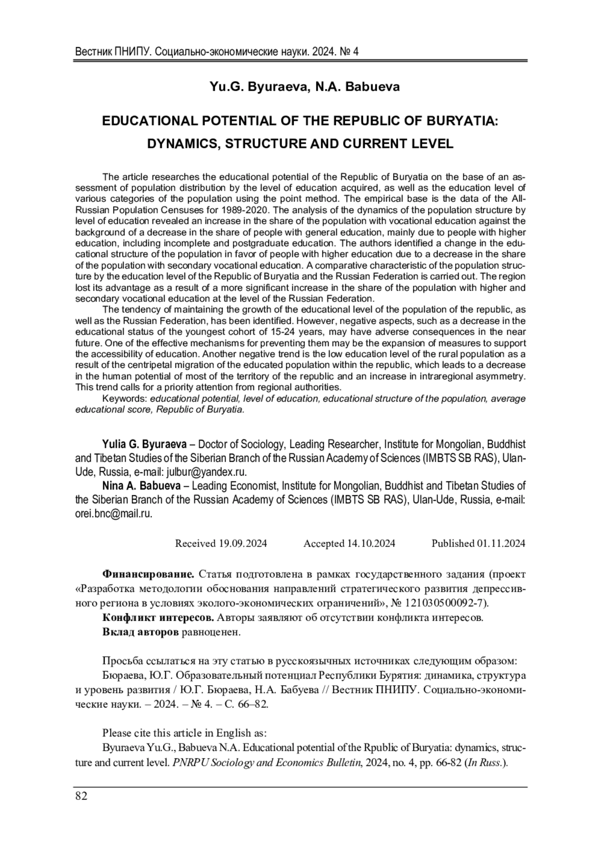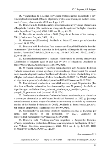 25. Бюраева, Ю.Г. Внутрирегиональная миграция в Республике Бурятия: объемы, направления, последствия / Ю.Г. Бюраева // ЭКО. - 2023. - № 4. - С. 149-165. DOI: 10.30680/ECO0131-7652-2023-4-149-165 EDN: LKYDAA