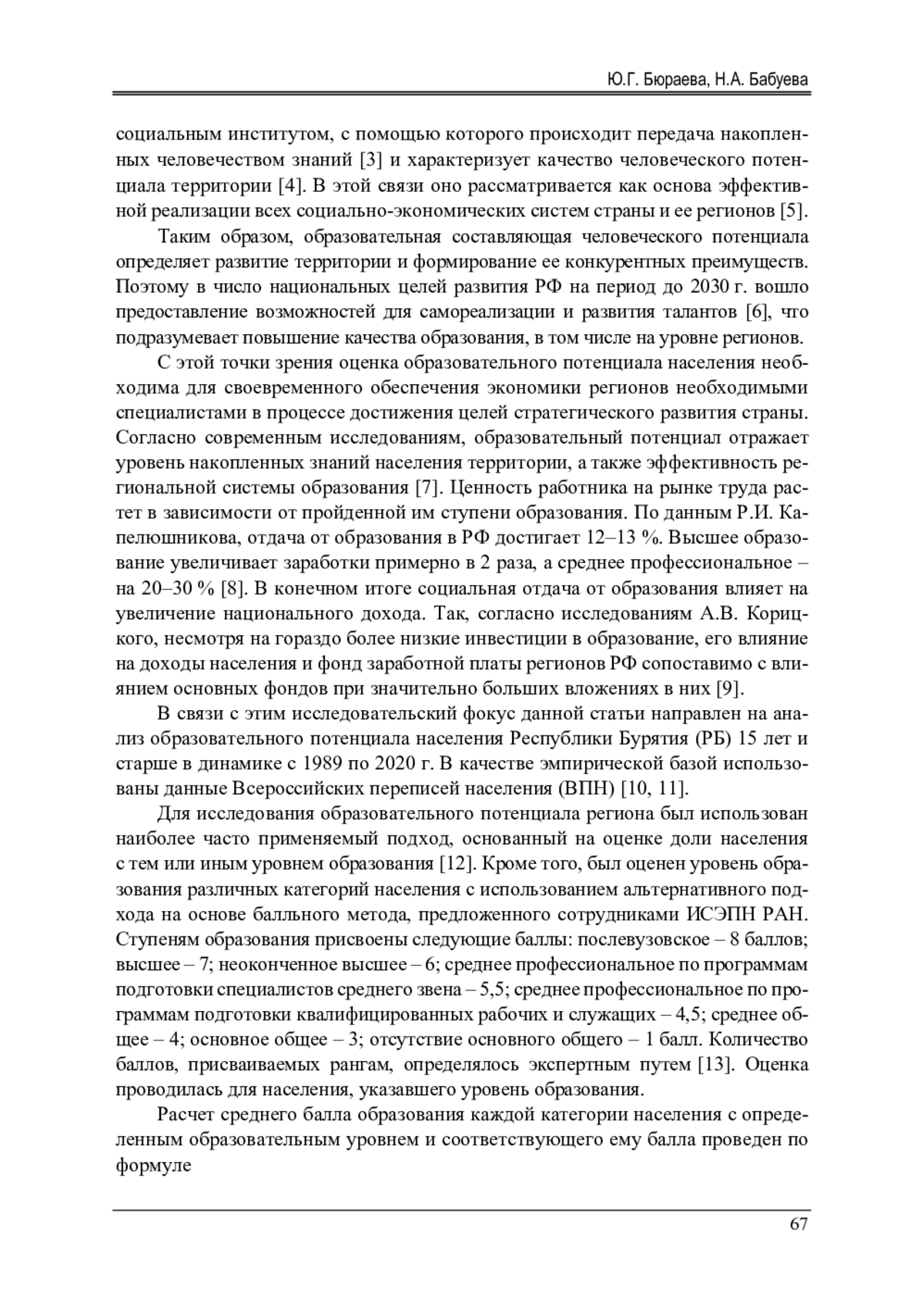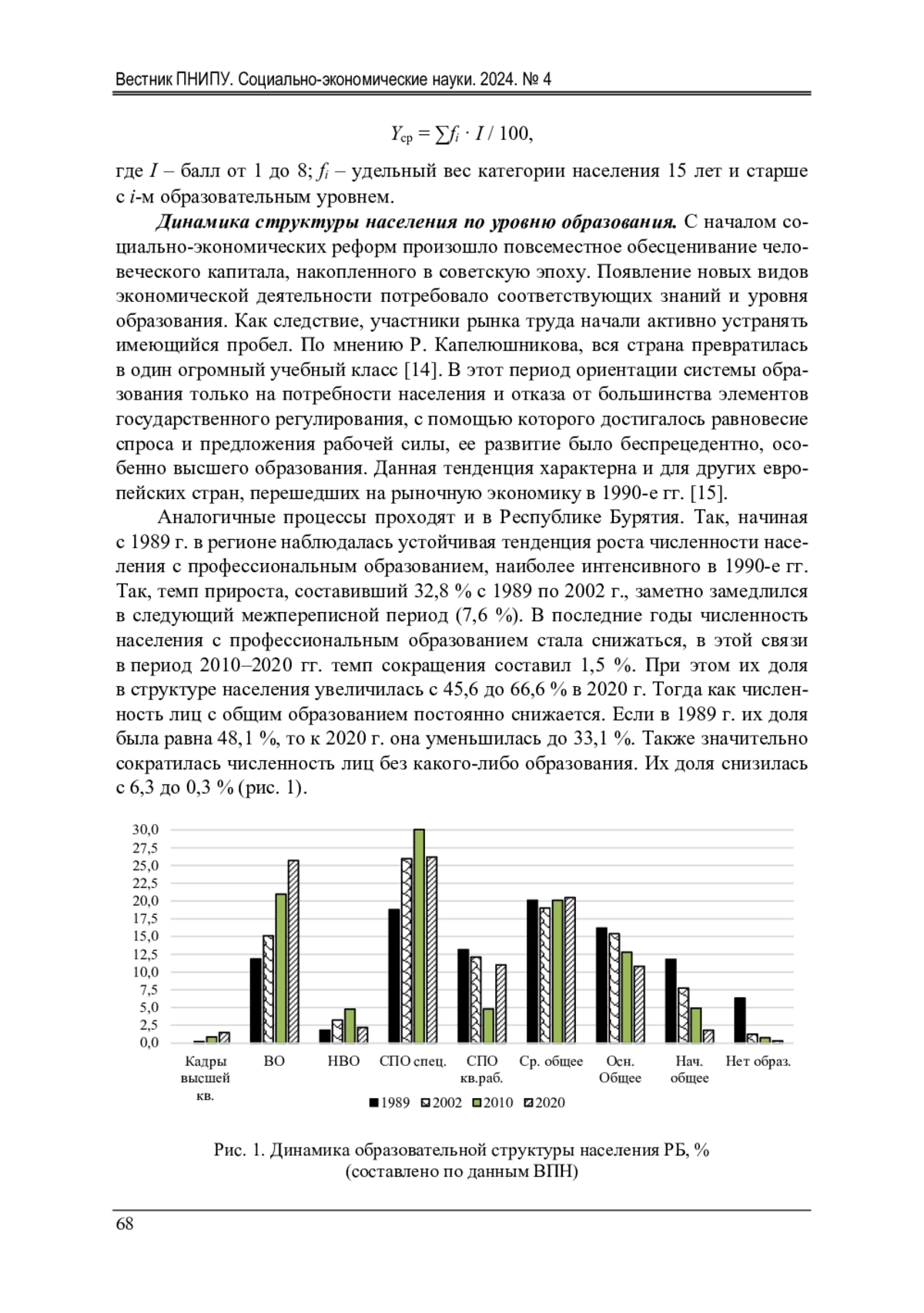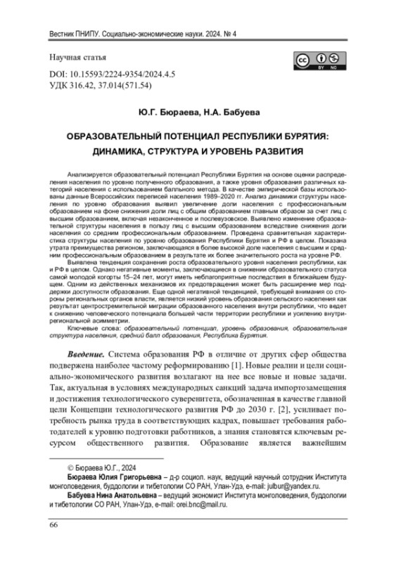 Анализируется образовательный потенциал Республики Бурятия на основе оценки распределения населения по уровню полученного образования, а также уровня образования различных категорий населения с использованием балльного метода. В качестве эмпирической базы использованы данные Всероссийских переписей населения 1989-2020 гг. Анализ динамики структуры населения по уровню образования выявил увеличение доли населения с профессиональным образованием на фоне снижения доли лиц с общим образованием главным образом за счет лиц с высшим образованием, включая незаконченное и послевузовское. Выявлено изменение образовательной структуры населения в пользу лиц с высшим образованием вследствие снижения доли населения со средним профессиональным образованием. Проведена сравнительная характеристика структуры населения по уровню образования Республики Бурятия и РФ в целом. Показана утрата преимущества регионом, заключающаяся в более высокой доле населения с высшим и средним профессиональным образованием в результате их более значительного роста на уровне РФ. Выявлена тенденция сохранения роста образовательного уровня населения республики, как и РФ в целом. Однако негативные моменты, заключающиеся в снижении образовательного статуса самой молодой когорты 15-24 лет, могут иметь неблагоприятные последствия в ближайшем будущем. Одним из действенных механизмов их предотвращения может быть расширение мер поддержки доступности образования. Еще одной негативной тенденцией, требующей внимания со стороны региональных органов власти, является низкий уровень образования сельского населения как результат центростремительной миграции образованного населения внутри республики, что ведет к снижению человеческого потенциала большей части территории республики и усилению внутрирегиональной асимметрии