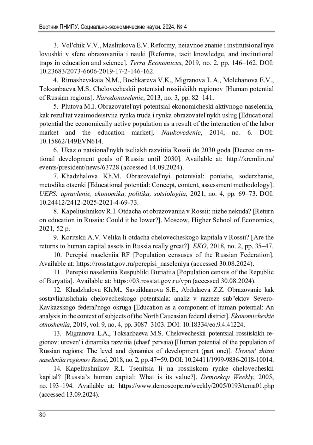 4. Человеческий потенциал российских регионов / Н.М. Римашевская, В.К. Бочкарева, Л.А. Мигранова, Е.В. Молчанова, М.С. Токсанбаева // Народонаселение. - 2013. - № 3. - С. 82-141. EDN: RCOFVZ