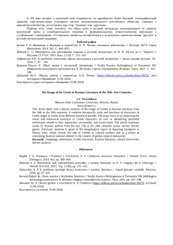 5. 	Шатунов Ю. А. Образы греков в творчестве А.П. Чехова (https://elibrary.petrsu.ru/books/show/30276, дата последнего обращения: 12.06.2024).