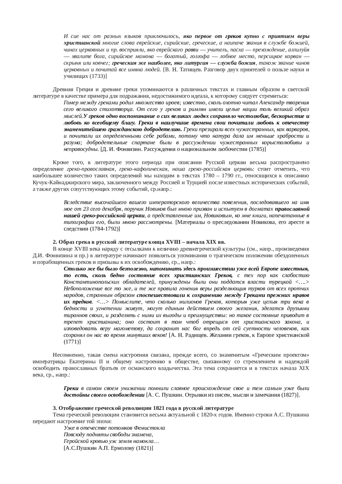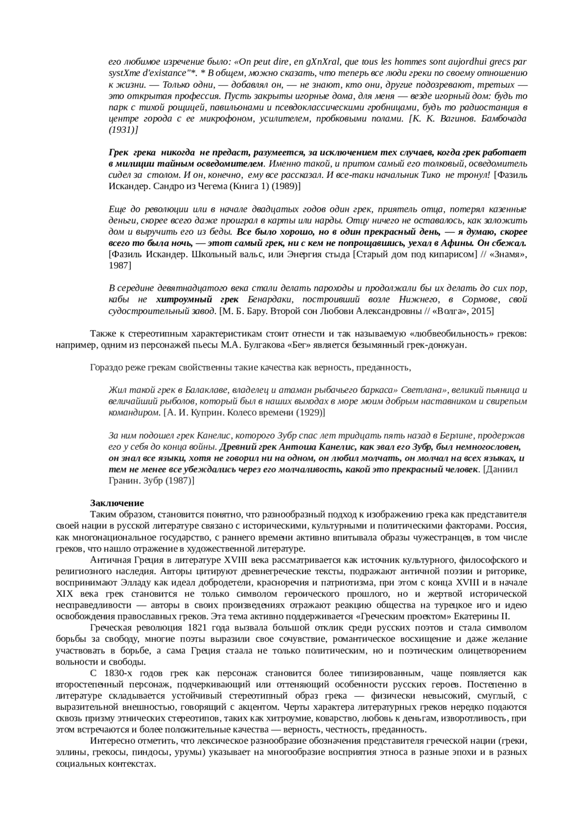 В статье проводится литературоведческий анализ образа греков в русской литературе с XVIII до XX века. Исследуются специфические черты и функции персонажей греческого происхождения в произведениях разных эпох. Основное внимание уделено анализу визуального и поведенческого портрета греческого персонажа, а также выявлению устойчивых стереотипов, связанных с их внешностью, характером и социальным статусом. Рассматриваются произведения русских писателей конца XVII – ХХ вв различной жанровой принадлежности. Особое внимание уделено имагологическому аспекту изображения иностранцев в литературном тексте, который позволяет выявить роль греков как культурного маркера и средства противопоставления русской самобытности в условиях глобального культурного взаимодействия.