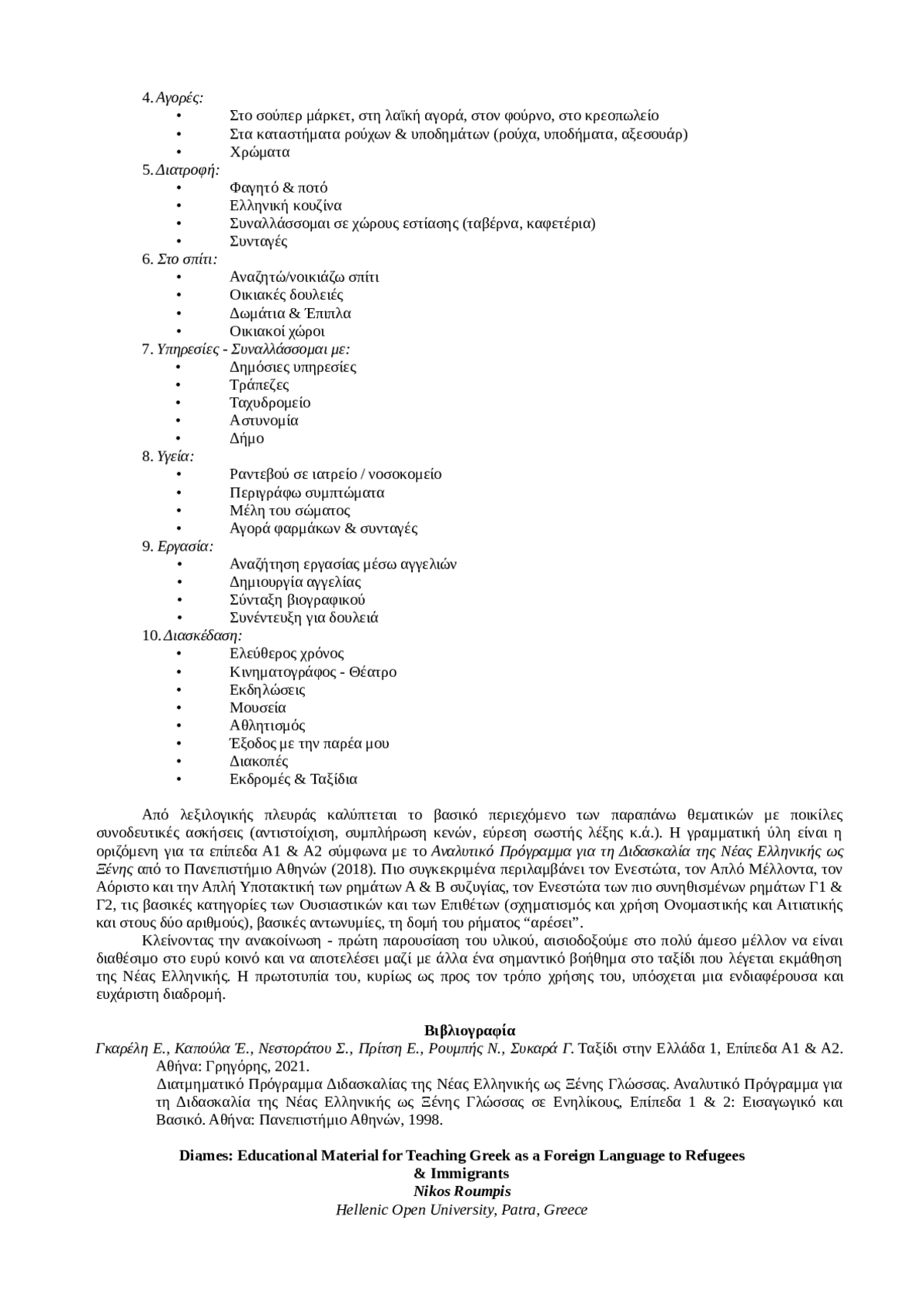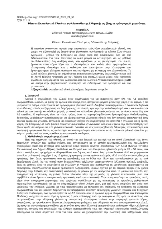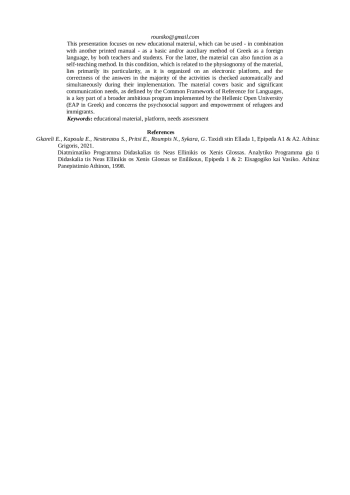 Η παρούσα ανακοίνωση αφορά στην παρουσίαση ενός νέου εκπαιδευτικού υλικού, που μπορεί να αξιοποιηθεί ως βασικό ή/και βοηθητικό, συνδυαστικά με κάποιο άλλο έντυπο εγχειρίδιο - μέθοδο της Ελληνικής ως ξένης, τόσο από διδάσκοντες, όσο και από διδασκόμενους. Για τους δεύτερους το υλικό μπορεί να λειτουργήσει και ως μέθοδος αυτοδιδασκαλίας. Στη συνθήκη αυτή, που σχετίζεται με τη φυσιογνωμία του υλικού, βρίσκεται κατά κύριο λόγο και η ιδιαιτερότητα του, καθώς είναι οργανωμένο σε ηλεκτρονική πλατφόρμα και η ορθότητα των απαντήσεων στην πλειοψηφία των δραστηριοτήτων ελέγχεται αυτόματα και ταυτόχρονα με τη στιγμή που υλοποιούνται. Το υλικό καλύπτει βασικές και σημαίνουσες επικοινωνιακές ανάγκες, όπως ορίζονται και από το Κοινό Πλαίσιο Αναφοράς για τις Γλώσσες και αποτελεί κύριο μέρος ενός ευρύτερου φιλόδοξου προγράμματος που υλοποιείται από το Ελληνικό Ανοικτό Πανεπιστήμιο (ΕΑΠ) και αφορά στην ψυχοκοινωνική υποστήριξη και ενδυνάμωση των προσφύγων και των μεταναστών.