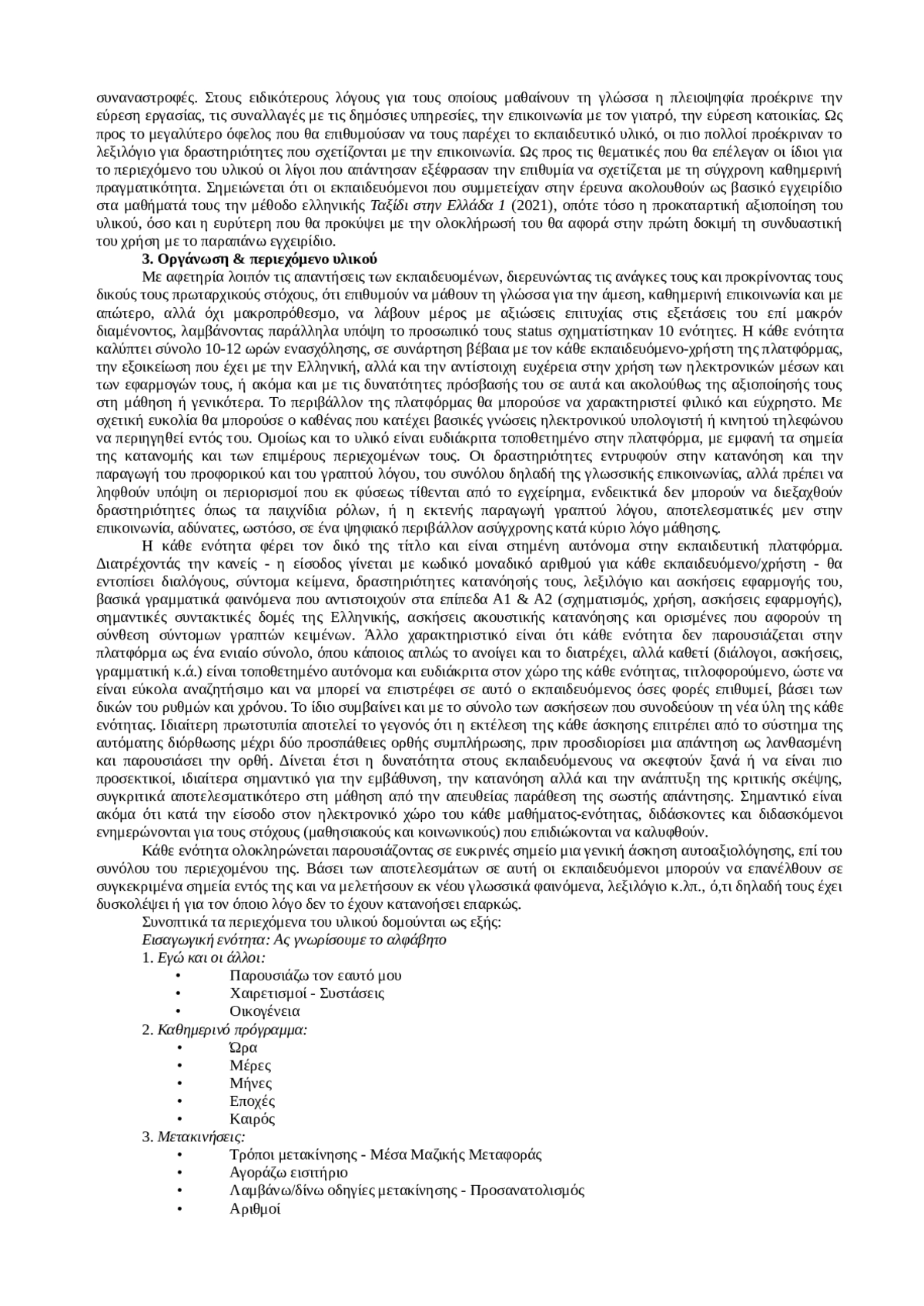 Это объявление касается презентации нового учебного материала, который может быть использован как основной и/или вспомогательный в сочетании с другим печатным пособием - “Метод изучения греческого языка как иностранного”, как преподавателями, так и студентами. Для последних этот материал может также служить методом самообучения. В этом условии, которое связано с характером материала, заключается прежде всего его специфика, поскольку оно организовано на электронной платформе и правильность ответов на большинство заданий контролируется автоматически и одновременно с моментом их выполнения. Этот материал охватывает основные и важные коммуникативные потребности, определенные в соответствии с общими требованиями к языкам, и является основной частью более широкой амбициозной программы, реализуемой Греческим открытым университетом (HOU), и касается психосоциальной поддержки и расширения прав и возможностей беженцев и мигрантов.