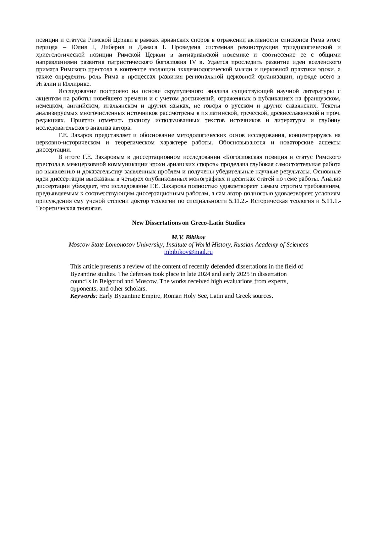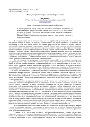 В статье представлен обзор содержания новейших защищенных диссертаций по византиноведению. Защиты проходили в конце 2024 – начале 2025 гг. в диссоветах Белгорода и Москвы. Работы получили высокие оценки экспертов, оппонентов и других специалистов.