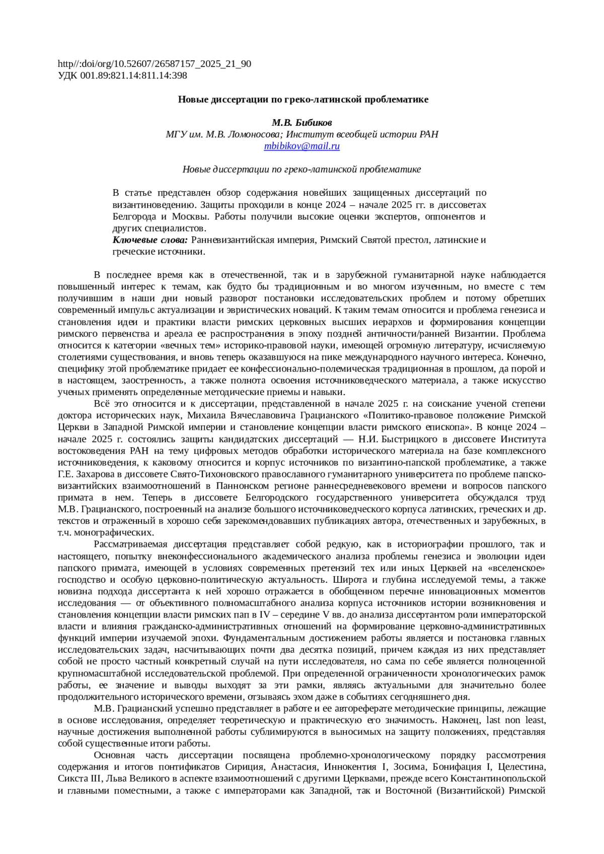 В последнее время как в отечественной, так и в зарубежной гуманитарной науке наблюдается повышенный интерес к темам, как будто бы традиционным и во многом изученным, но вместе с тем получившим в наши дни новый разворот постановки исследовательских проблем и потому обретших современный импульс актуализации и эвристических новаций. К таким темам относится и проблема генезиса и становления идеи и практики власти римских церковных высших иерархов и формирования концепции римского первенства и ареала ее распространения в эпоху поздней античности/ранней Византии. Проблема относится к категории «вечных тем» историко-правовой науки, имеющей огромную литературу, исчисляемую столетиями существования, и вновь теперь оказавшуюся на пике международного научного интереса. Конечно, специфику этой проблематике придает ее конфессионально-полемическая традиционная в прошлом, да порой и в настоящем, заостренность, а также полнота освоения источниковедческого материала, а также искусство ученых применять определенные методические приемы и навыки.