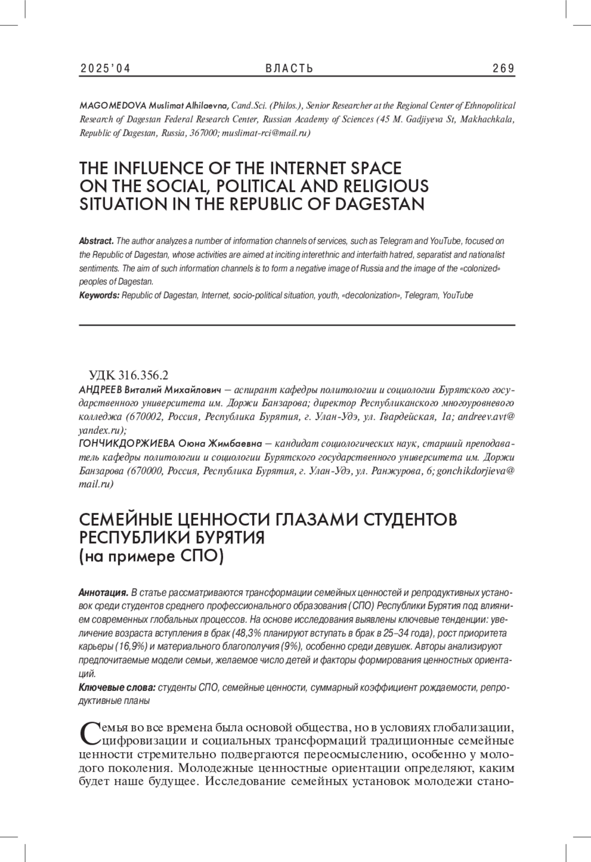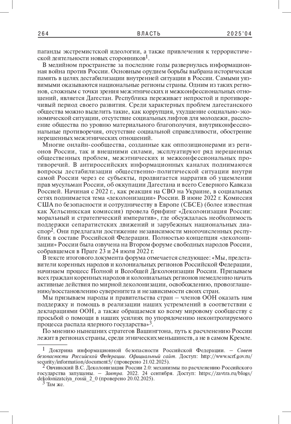 2. Габараева М.Р. 2024. Дискурс “деколонизации” в антироссийских telegram-каналах, ориентированных на Северный Кавказ (опыт контент-анализа). - Социологические исследования. № 8. С. 79-93. EDN: DKKBXS