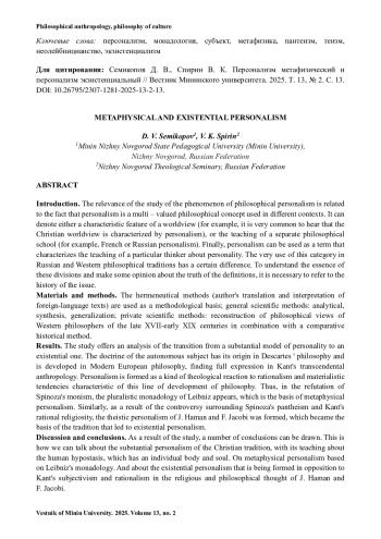 Результаты исследования. В исследовании предлагается анализ перехода от субстанциональной модели личности к экзистенциальной. Учение об автономном субъекте имеет своим истоком философию Декарта и получает развитие в новоевропейской философии, находя полноту выражения в трансцендентальной антропологии Канта. Персонализм формируется как своего рода теологическая реакция на рационализм и материалистические тенденции, характерные для данной линии развития философии. Так в опровержение монизма Спинозы возникает плюралистическая монадология Лейбница, являющаяся основой метафизического персонализма. Подобным же образом, в результате споров вокруг пантеизма Спинозы и рациональной религиозности Канта формируется теистический персонализм И. Гамана и Ф. Якоби, ставший основой традиции, приведшей к экзистенциальному персонализму.