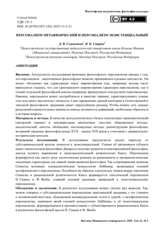 Обсуждение и заключения. В результате исследования можно сделать ряд выводов. Так, можно говорить о субстанциональном персонализме христианской традиции, с его учением о человеческой ипостаси, обладающей индивидуальными телом и душой; о метафизическом персонализме, имеющем своей основой монадологию Лейбница, и об экзистенциальном персонализме, формирующемся в противостоянии с субъективизмом и рационализмом Канта в религиозно-философской мысли И. Гамана и Ф. Якоби.