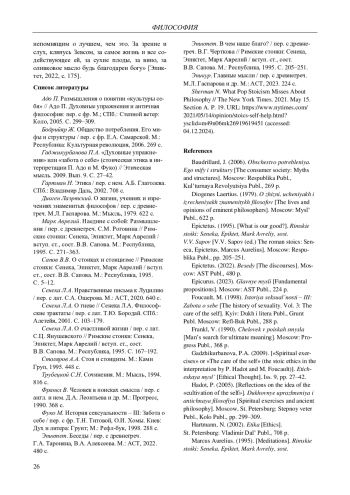 3. Гаджикурбанова П.А. “Духовные упражнения” или “забота о себе” (стоическая этика в интерпретации П. Адо и М. Фуко) // Этическая мысль. 2009. Вып. 9. С. 27-42. EDN: LGKKST