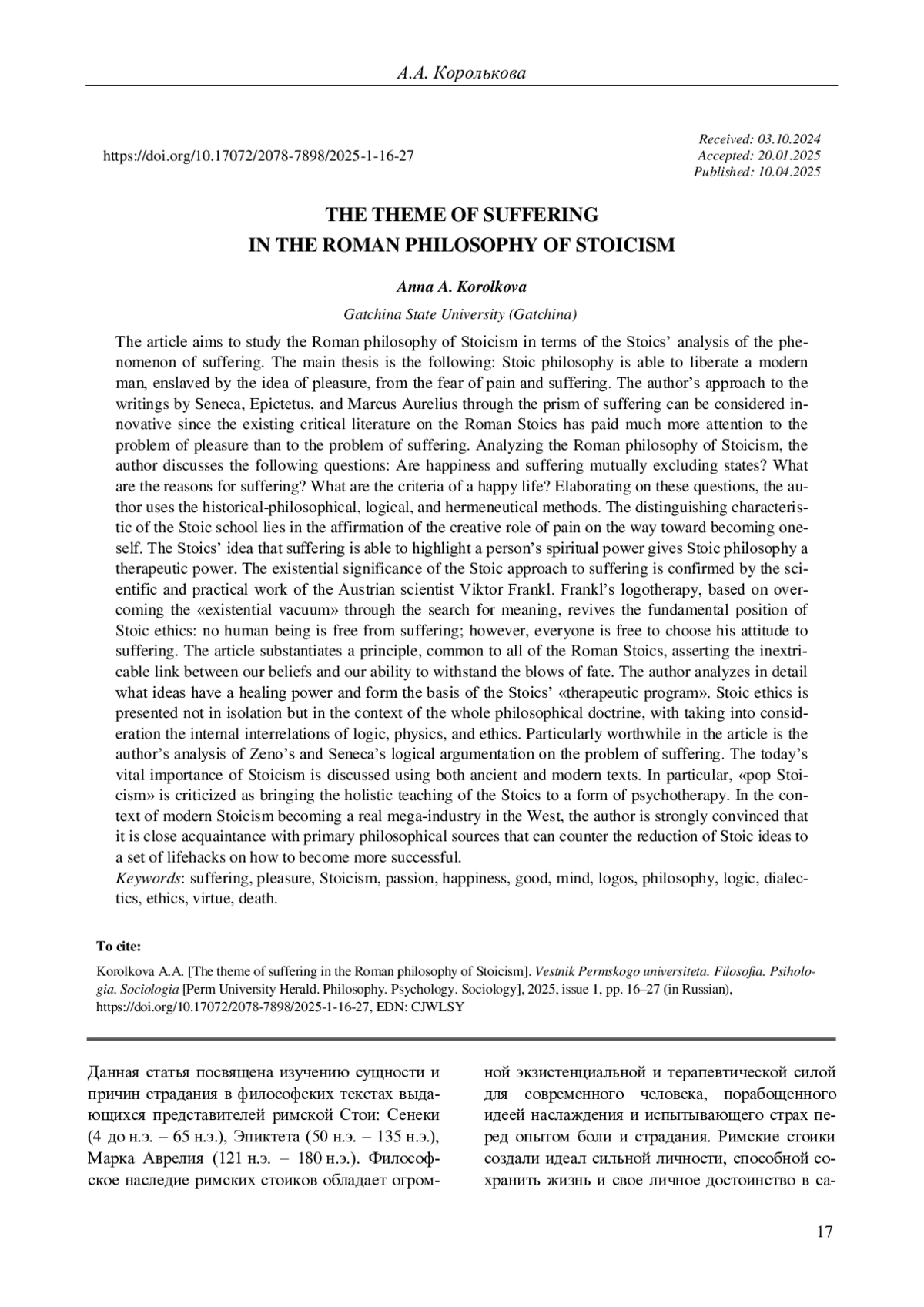 Данная статья посвящена изучению сущности и причин страдания в философских текстах выдающихся представителей римской Стои: Сенеки (4 до н. э. – 65 н. э.), Эпиктета (50 н. э. – 135 н. э.), Марка Аврелия (121 н. э. – 180 н. э.). Философское наследие римских стоиков обладает огромной экзистенциальной и терапевтической силой для современного человека, порабощенного идеей наслаждения и испытывающего страх перед опытом боли и страдания.
