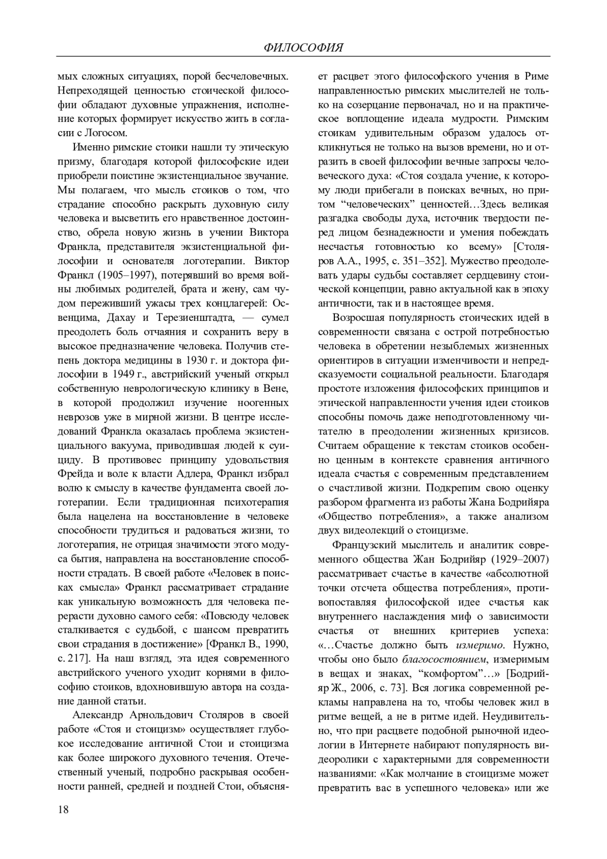 Цель данной статьи - рассмотреть учение римских стоиков с точки зрения их анализа феномена страдания. В процессе исследования раскрывается главный тезис: философия стоиков способна освободить современного человека, порабощенного идеей наслаждения, от страха перед опытом боли и страдания. Считаем подход к текстам Сенеки, Эпиктета и Марка Аврелия через призму страдания новаторским, т. к. в критической литературе, исследующей наследие стоиков, гораздо больше внимания уделялось проблеме удовольствия, нежели страдания. В процессе анализа стоической философии разбираются следующие вопросы: являются ли счастье и страдание взаимоисключающими состояниями? Каковы причины страдания? В чем состоят критерии счастливой жизни? При раскрытии указанных выше вопросов используются историко-философский, герменевтический и логический методы. Особенность стоической школы заключается в утверждении созидательной роли боли на пути к становлению самим собой. Идея стоиков о способности страдания высветить духовную силу человека сообщает стоической концепции терапевтическую силу. Экзистенциальная значимость стоического подхода к страданиям подтверждается научно-практической деятельностью австрийского ученого Виктора Франкла. Логотерапия Франкла, основанная на преодолении «экзистенциального вакуума» через поиск смысла, возрождает фундаментальное положение стоической этики: ни один человек не свободен от страданий, однако каждый свободен в выборе своей установки по отношению к страданию. В статье обосновывается общий для всех римских стоиков принцип, утверждающий неразрывную связь между нашими убеждениями и способностью выдерживать удары судьбы. Автор подробно разбирает, какие именно представления обладают целительной силой и составляют основу «терапевтической программы» стоиков. Этика стоиков раскрывается автором статьи не изолированно, но в контексте целостного философского учения, с учетом внутренних взаимосвязей логики, физики и этики. Особую ценность работе придает авторский анализ логической аргументации Зенона и Сенеки, посвященной теме страдания. Проблема актуальности стоицизма в современности обсуждается автором с привлечением как античных, так и современных текстов. В частности, осуществляется критика «поп-стоицизма», сводящего целостное учение стоиков к разновидности психотерапии. В условиях превращения современного стоицизма в настоящую мега-индустрию на Западе, считаем, что именно обращение к философским первоисточникам способно противостоять редукции идей стоиков к набору жизненных советов о том, как стать успешнее.