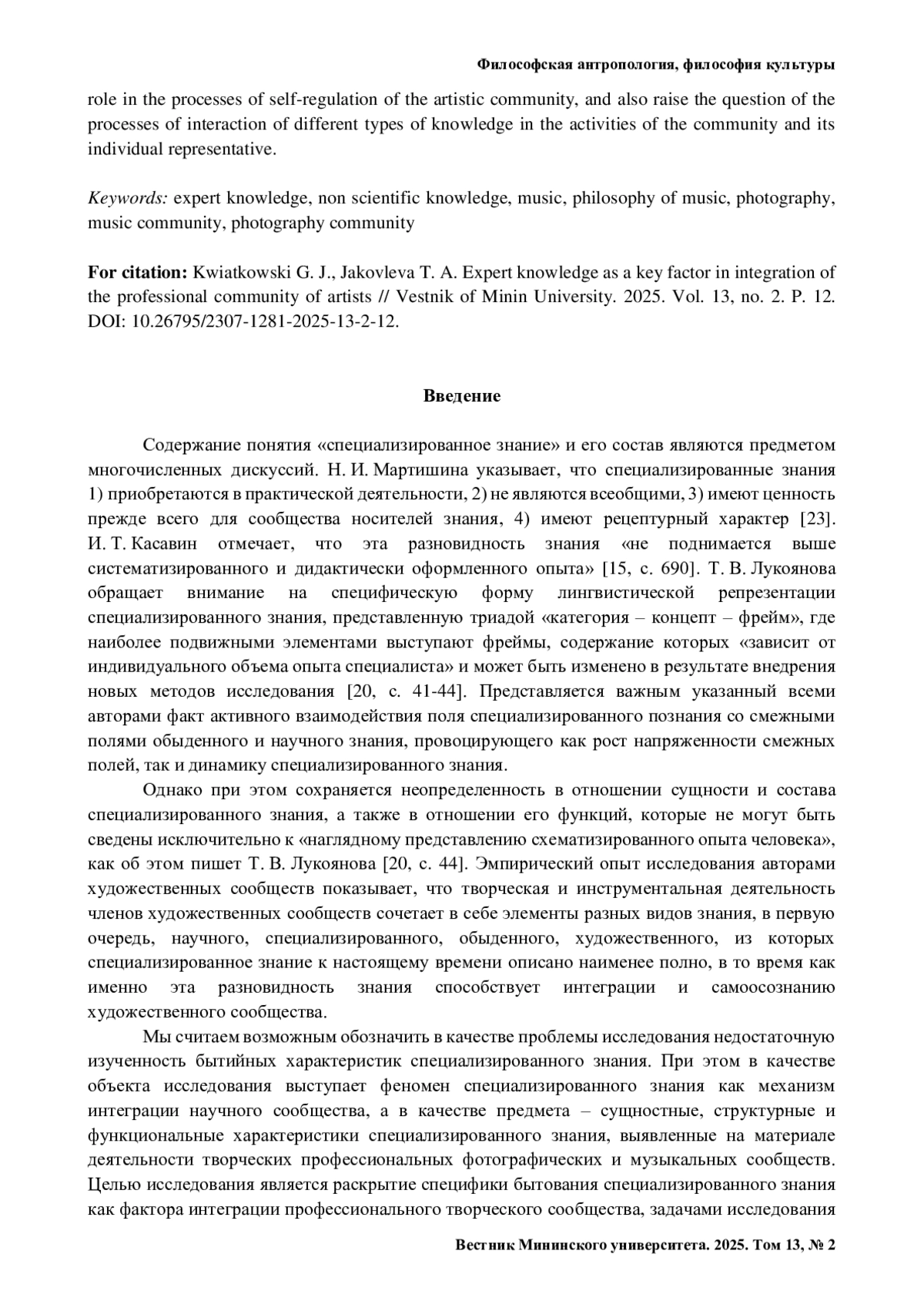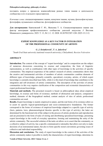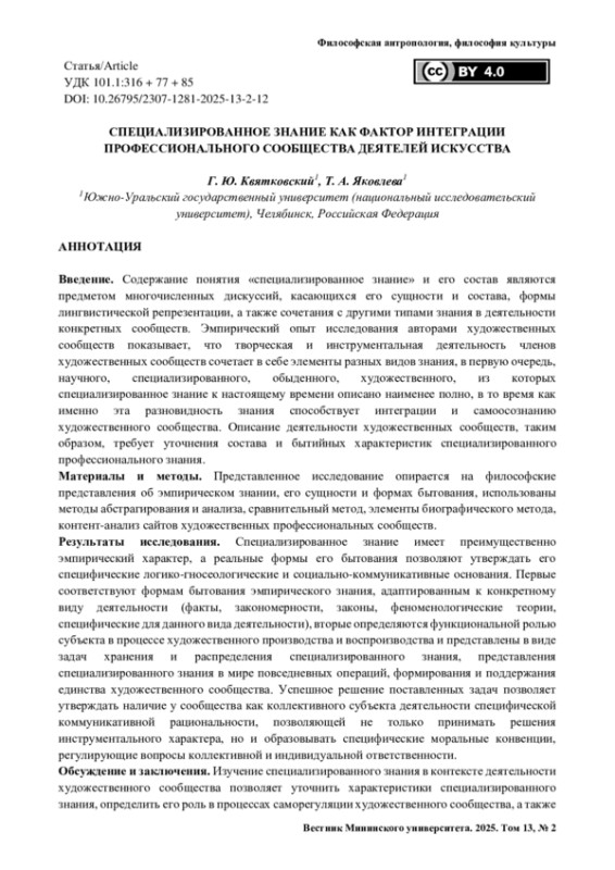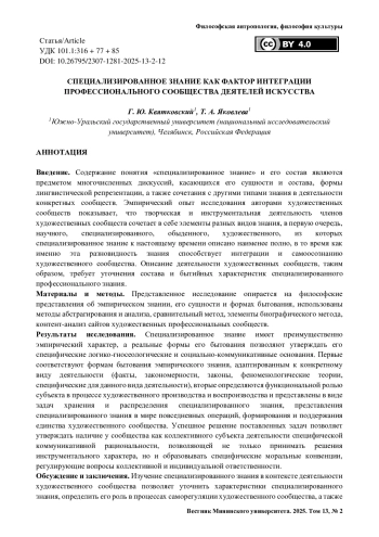 Введение. Содержание понятия «специализированное знание» и его состав являются предметом многочисленных дискуссий, касающихся его сущности и состава, формы лингвистической репрезентации, а также сочетания с другими типами знания в деятельности конкретных сообществ. Эмпирический опыт исследования авторами художественных сообществ показывает, что творческая и инструментальная деятельность членов художественных сообществ сочетает в себе элементы разных видов знания, в первую очередь, научного, специализированного, обыденного, художественного, из которых специализированное знание к настоящему времени описано наименее полно, в то время как именно эта разновидность знания способствует интеграции и самоосознанию художественного сообщества. Описание деятельности художественных сообществ, таким образом, требует уточнения состава и бытийных характеристик специализированного профессионального знания.