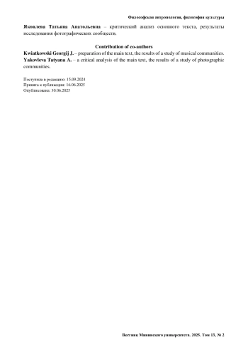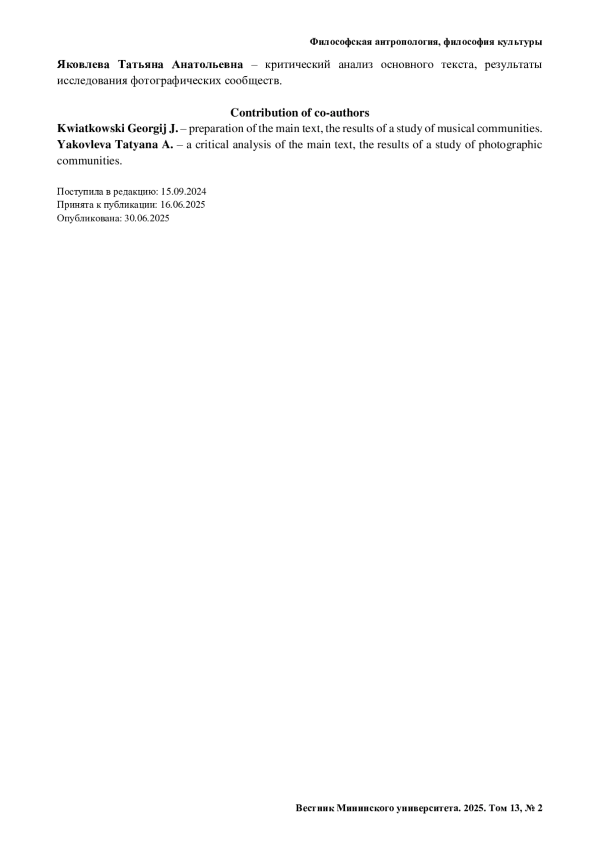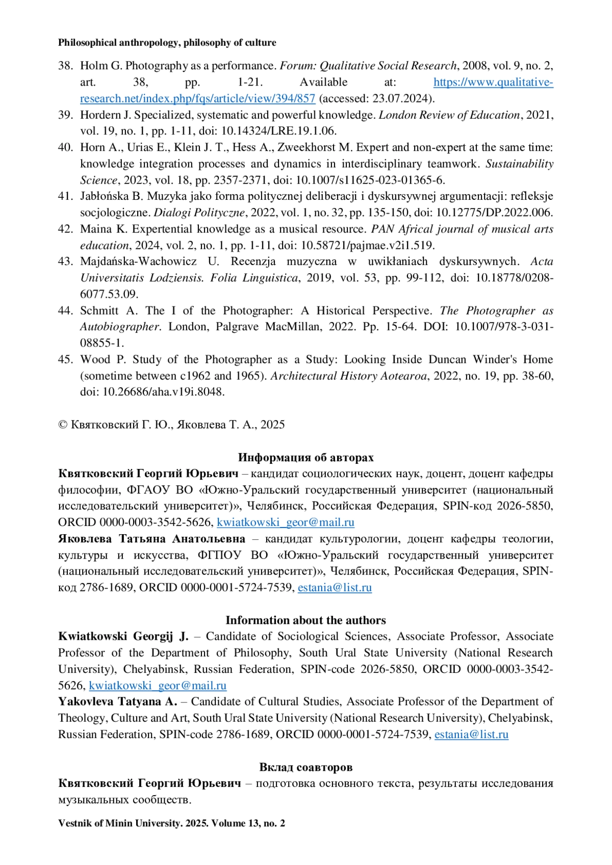 Поскольку наше исследование посвящено вопросам бытования конкретной разновидности специализированного знания, авторы также обращались к литературе, характеризующей специфические профессиональные сообщества (музыкальное и фотографическое) с точки зрения их исторического становления [5; 29; 33] и современного состояния [35; 36].